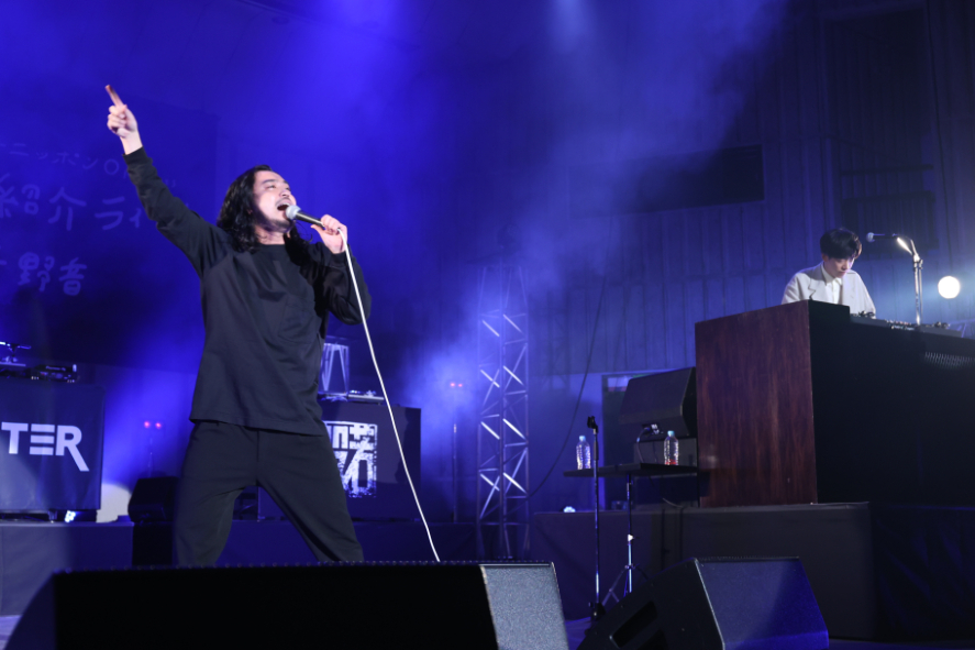 オープニングは、若き漫才師の気持ちを書き下ろした「板の上の魔物」という、1曲目からテンション上がる楽曲からスタート。集まったリスナーは声を出さずに手拍子と体を大きく揺らすことで、盛り上がりを表現する。「声は出せないけど、手を挙げたり飛び跳ねるのは“合法”らしいぞ!」というR-指定の煽りで始まった2曲目は、「合法的トビ方ノススメ」。それに応えるように、リスナーの熱量も絶好調。「飛び跳ねろ!」という煽りに合わせて全力でジャンプするなど、会場を揺らしてみせた。