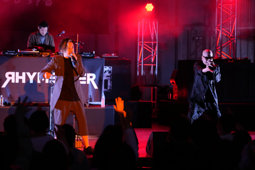 2曲目も、みんな一緒に盛り上がれるパーティーチューン「Back&Forth」へと続いていく。観客の前でライブをするのが1年以上ぶりだと話すRHYMESTERだが、「Creepy Nutsは公の場で『RHYMESTERに影響を受けた』と話してくれるから良い。他の人は公に話してくれない」といった話題でMCコーナーを盛り上げる。