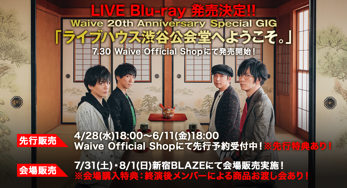 Waiveが今年2月23日(火・祝)に開催した結成20周年公演『Waive 20th Anniversary Special GIG「ライブハウス渋谷公会堂へようこそ。」』の模様がBlu-ray化、7月30日(金)よりWaiveオフィシャルWEBショップにて発売されることが決定した。