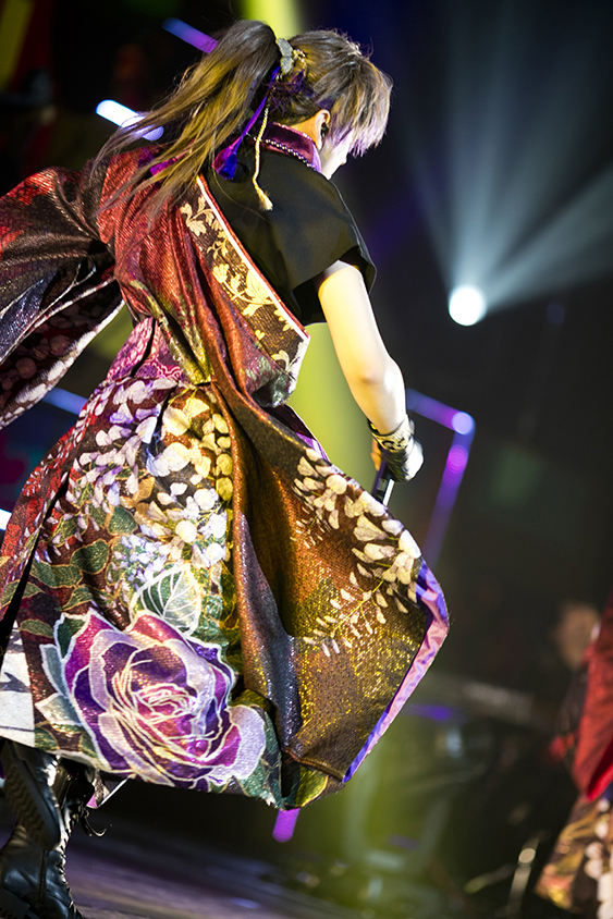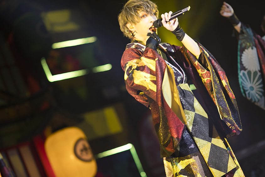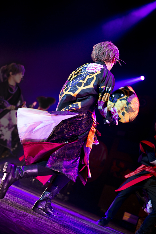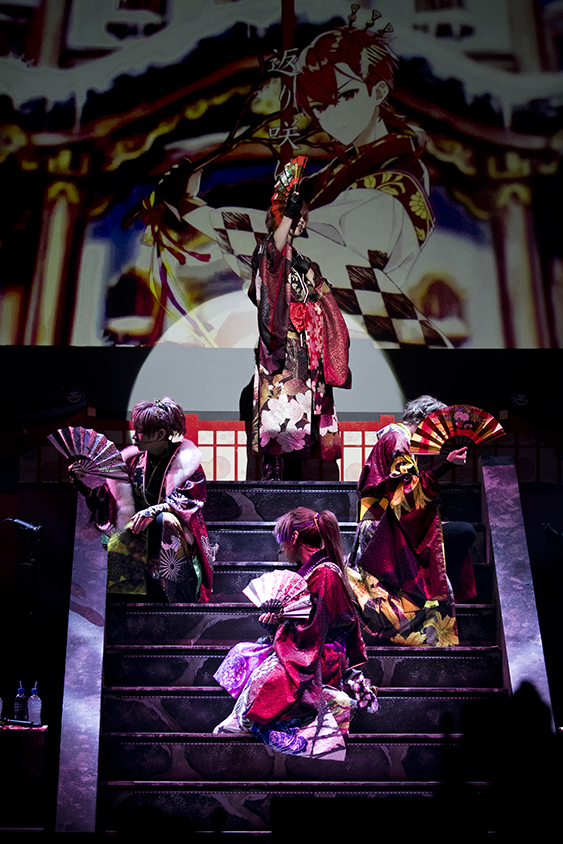 オープニングムービーそのまま、ツアーのテーマである“花魁”姿で、花街を思わせる絢爛なステージセットに表れた4人。扇を手に舞うひとりひとりにスポットライトが当たっていく、という演出も粋だ。