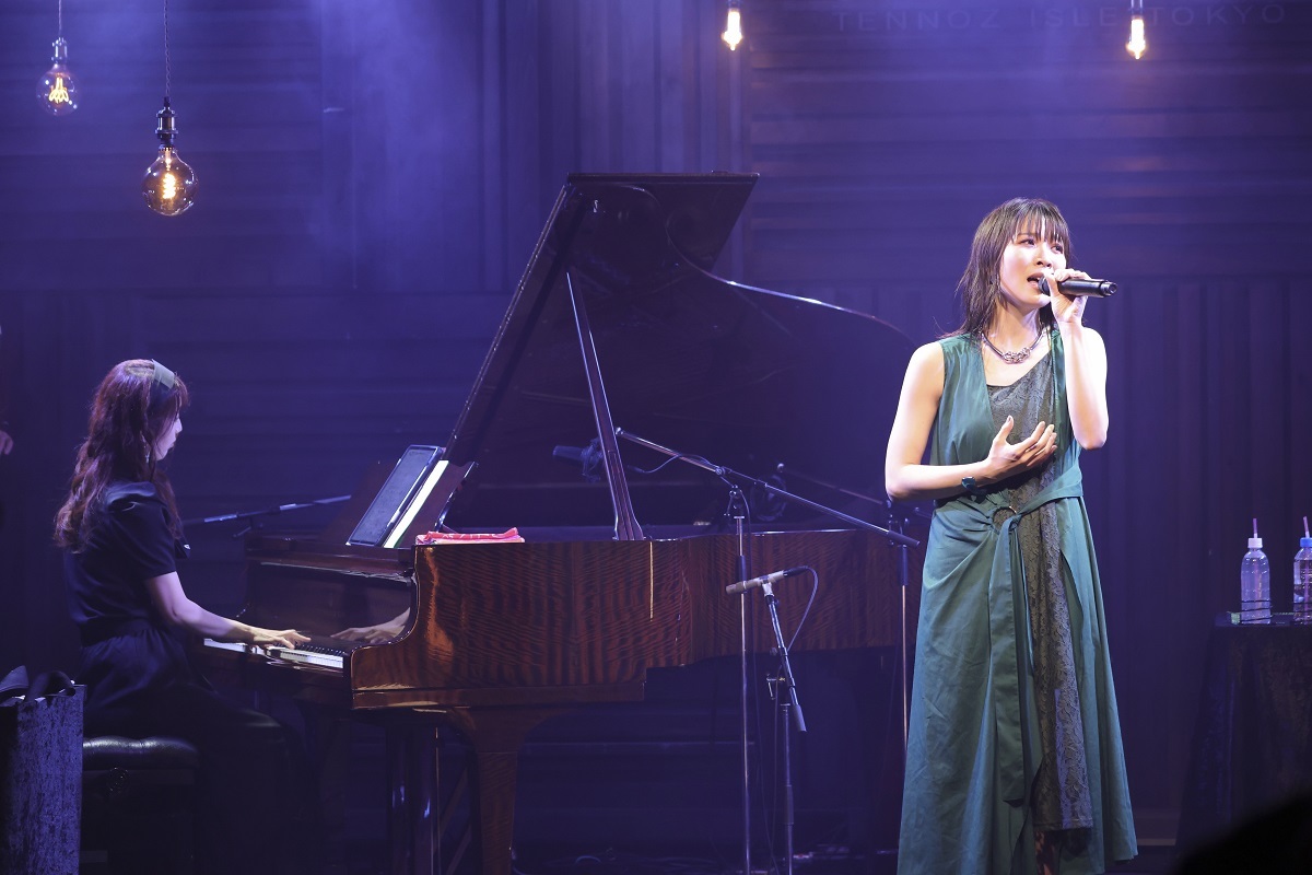 カウントダウンが終わると大嵜慶子のピアノ演奏と共にMay’nが登場。毎回、ライブコンセプトに合ったテーマカラーのステージ衣装に身を包んでいる彼女。「ACOUSTIC」では、シックな雰囲気に合わせた深緑色のワンピースに身を包み登場した。柔らかな照明の光に包まれ静かに始まったのは「LOVE,Close to me」。歌声を聴くとまた今月もMay’nの歌声を聴くことができる喜びと同時に安心感も沸き起こってくる。そんなホッとさせてくれる楽曲からライブは幕を開けた。