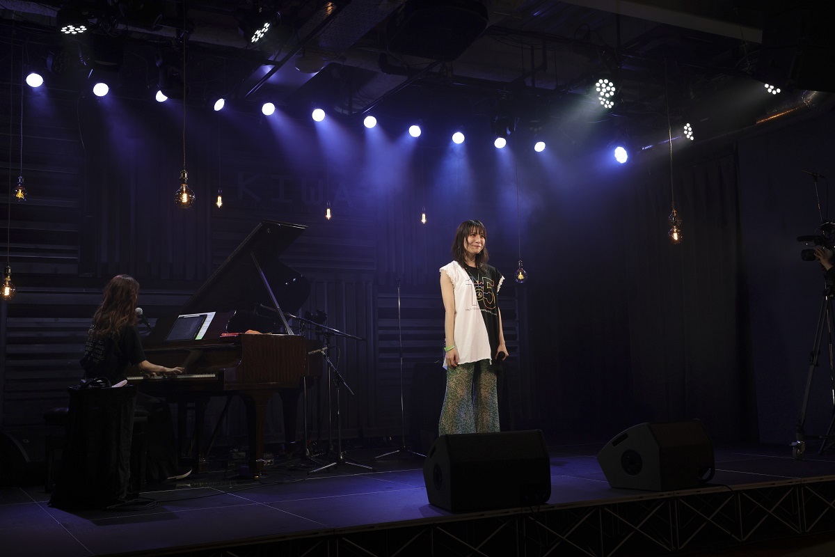 MC後には「stair」、「わたしのしるし」、「Sympathy」で大嵜と一緒に美しいハーモニーを響かせる。椅子に座ったまま叙情的にも情熱的にも歌い分け、声だけで空間をどんどん変化させていく姿につい見入ってしまう。歌詞も今の時代に呼応したような内容で静かに聴き入り、自分の部屋で聴いているライブということをつい忘れてしまった。「1 to 5」では、May’nの選曲の素晴らしさと、15年という活動期間で歌ってきた楽曲の多さに、ライブの度に改めて驚かされる。