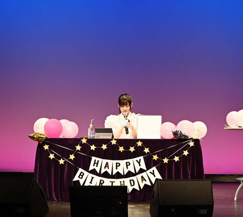 「今日は私の誕生日なりー! ということでお祝いしてもらいたいと思います!」と言って登場したのは、本日のイベントの司会進行を務める工藤プロデューサー。さっそくバースデーソングを歌い、ジュースで乾杯をする。大西さんも、ファンから寄せられるおめでとうのコメントを見ながら楽しんでいた。