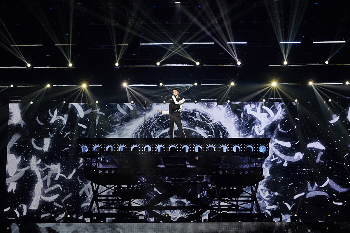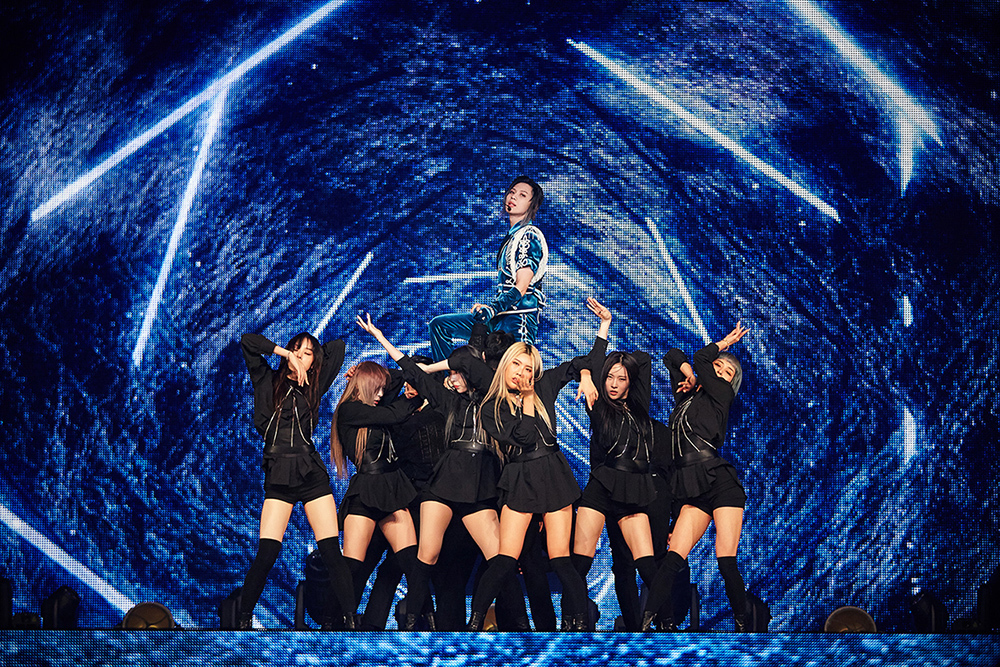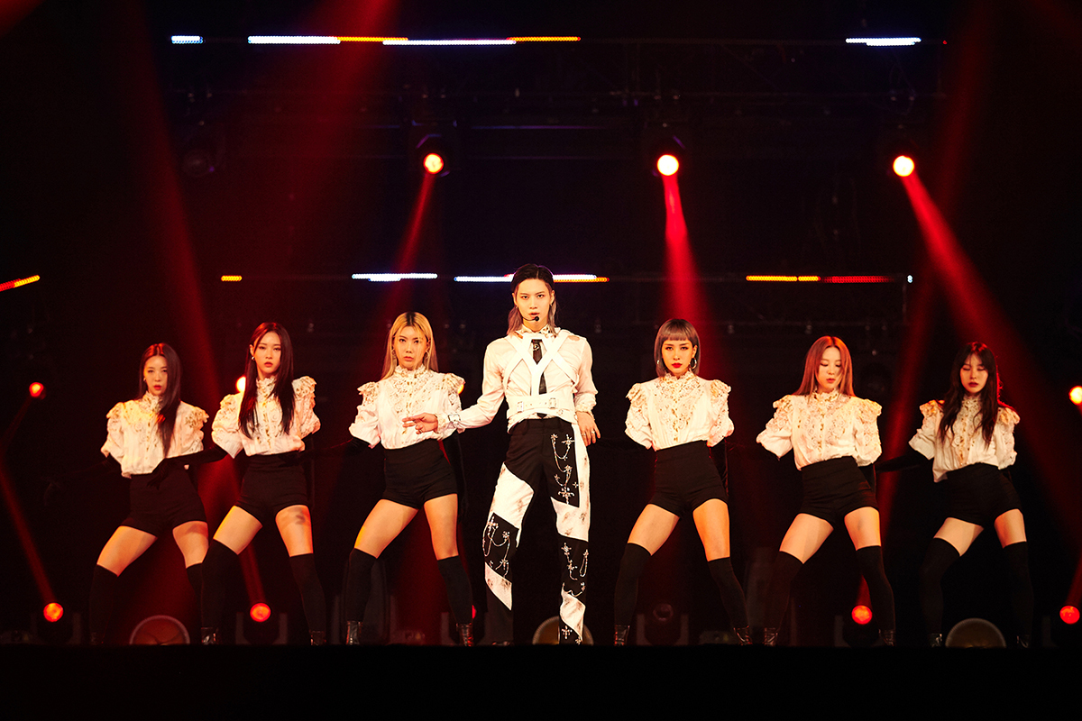 「Guess Who + Sexuality」では、降り注ぐレーザー光線を跳ね返すような攻撃的なパフォーマンスで魅了。両腕を縛ってのダンスが特徴の「Criminal」では、紐をほどいたあとに眼帯も取り、徐々に開放されていく世界観をよりドラマティックに表現。「IDEA:理想」では、ダンサーをしたがえての力強いフォーメーションダンスから、最後、手を広げて天を仰ぐ動作まで、一分の隙も見せない。