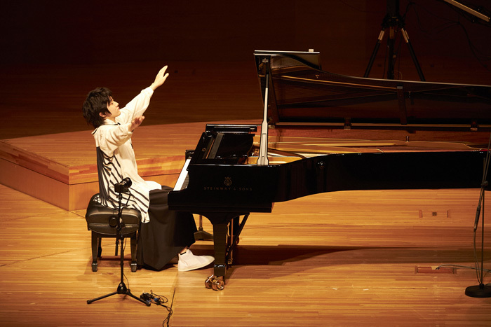 思わぬサプライズを経て、再びMCとして日野がステージに登場。本日、最後の出演者を紹介する。4人目のピアニストは、今、飛ぶ鳥落とす勢いで活躍をみせる角野隼斗。日野とのトークでは、本日の演奏曲目に盛り込まれた角野の自作品「大猫のワルツ」について、そしてショパンの名曲をエラールピアノで奏でる醍醐味について語った。