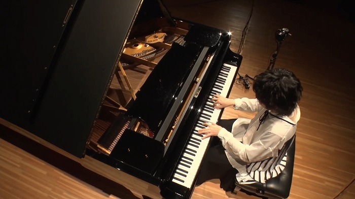 四曲目は楽器をスタインウェイからシゲル・カワイに変えて、大井の自作品「Piano Love」。アップビートの曲を流れるように、透明感あふれる音で紡いでゆく。高性能な現代的技術の粋が凝縮されたシゲル・カワイSK-EXから、みずみずしい音の粒がこぼれでるかのようだ。一見、エッジの利いた作品にも思えるが、大井の情感豊かで真綿のようなピュアで柔らかな音色は、会場の空間をあたたかく包み込む。鮮やかなピアニズムが粛々と展開されていくところが、いかにも大井の作品らしく、心地よい音のシャワーにしばしうっとりとしてしまうほどだ。