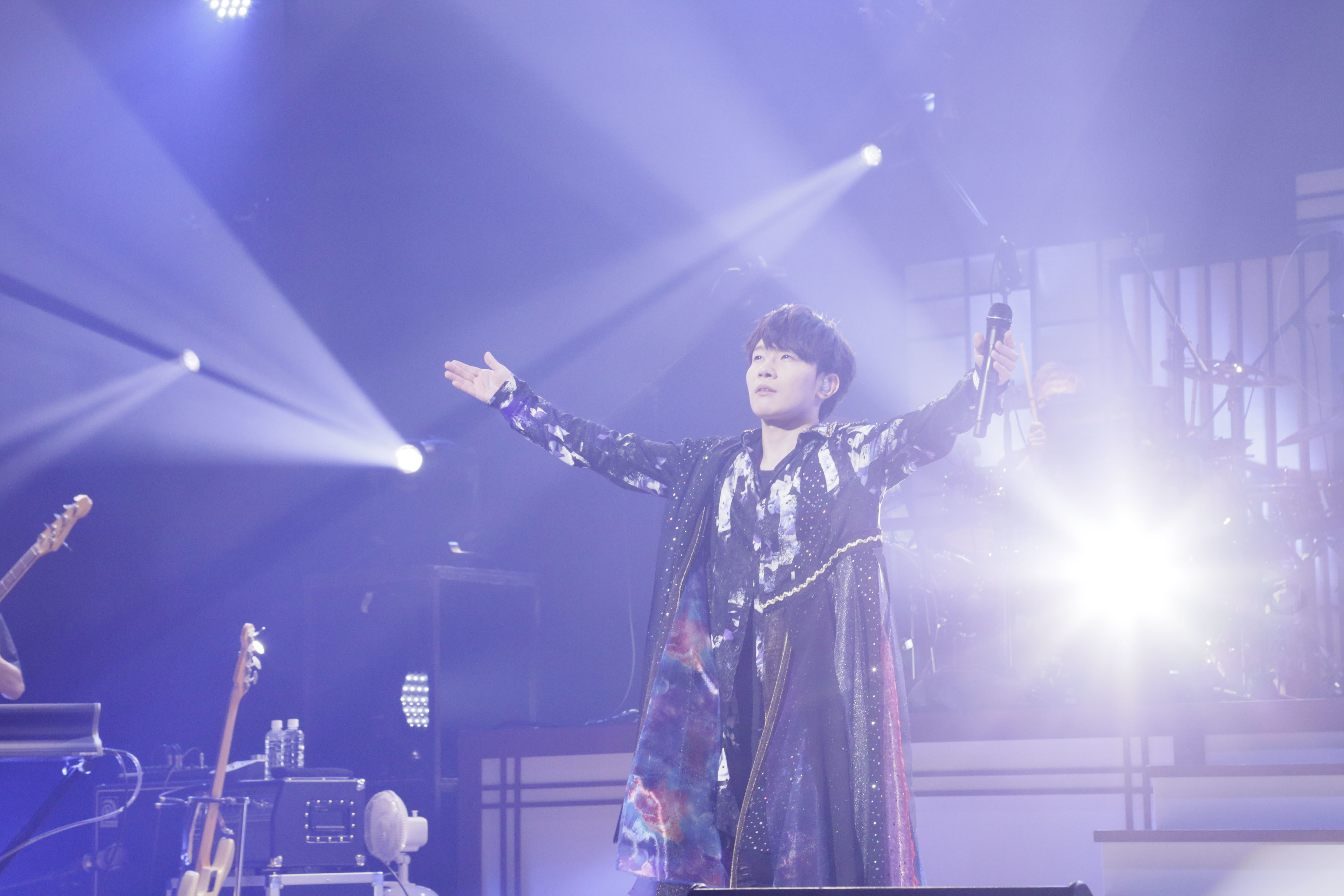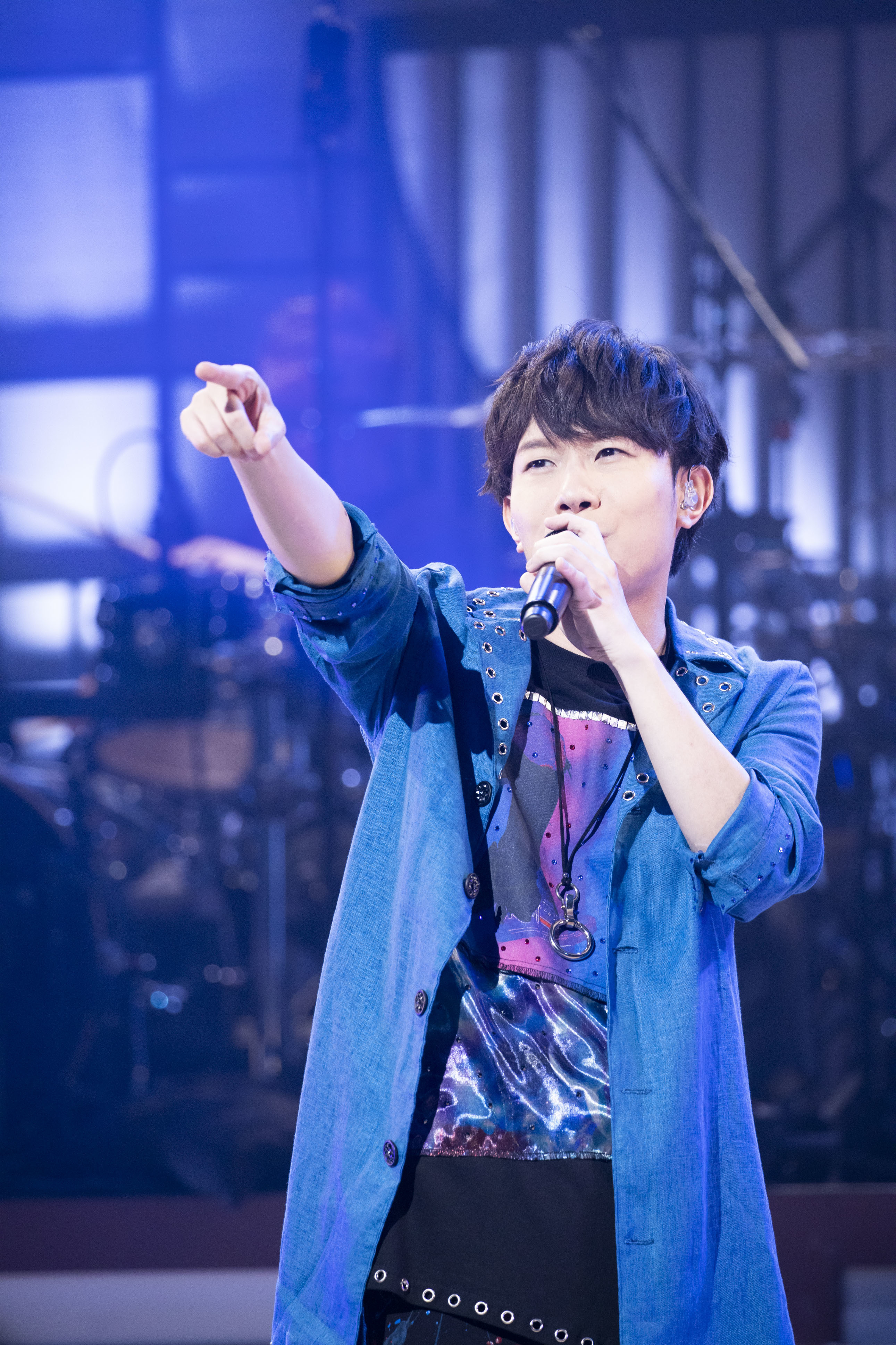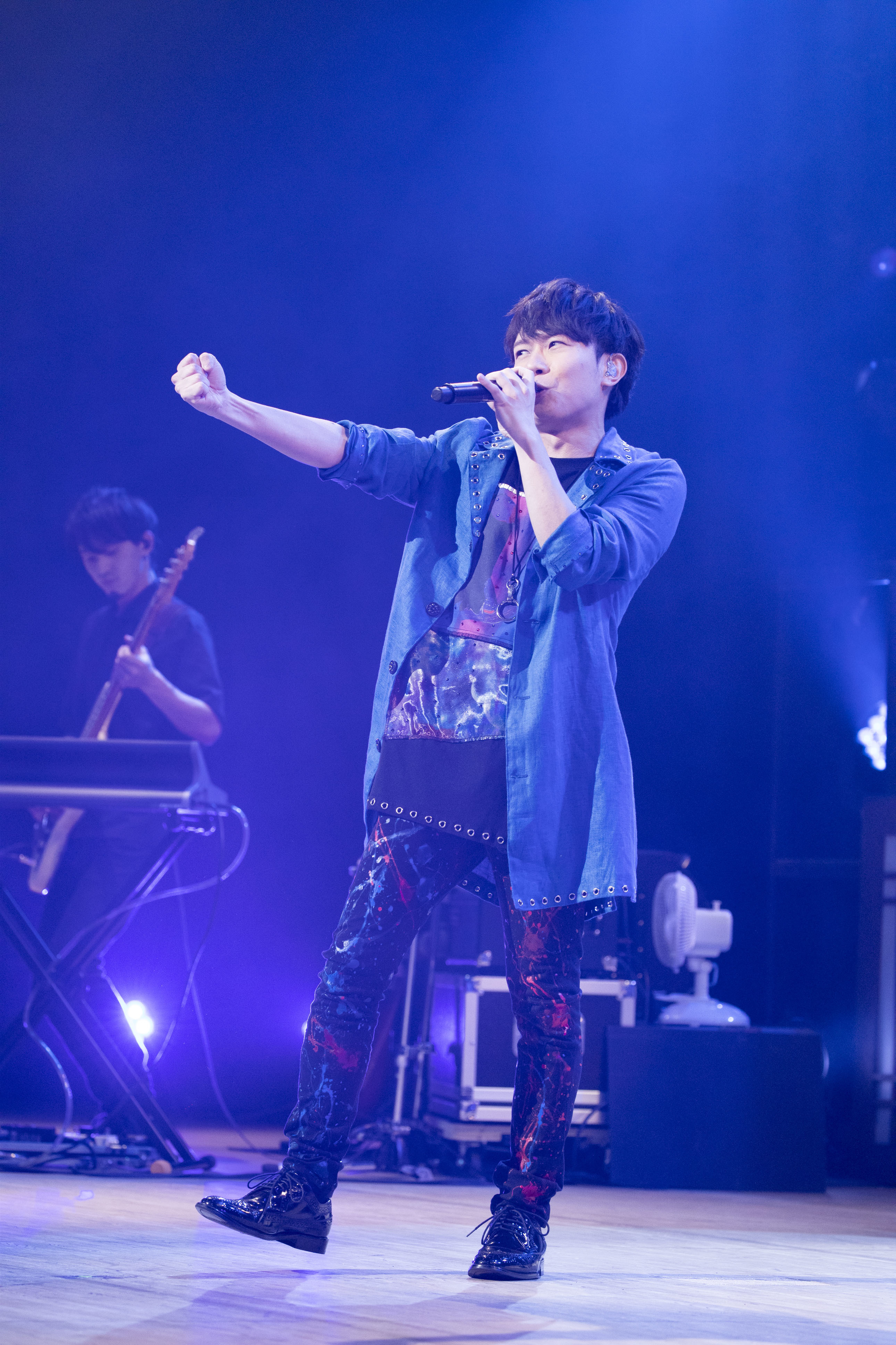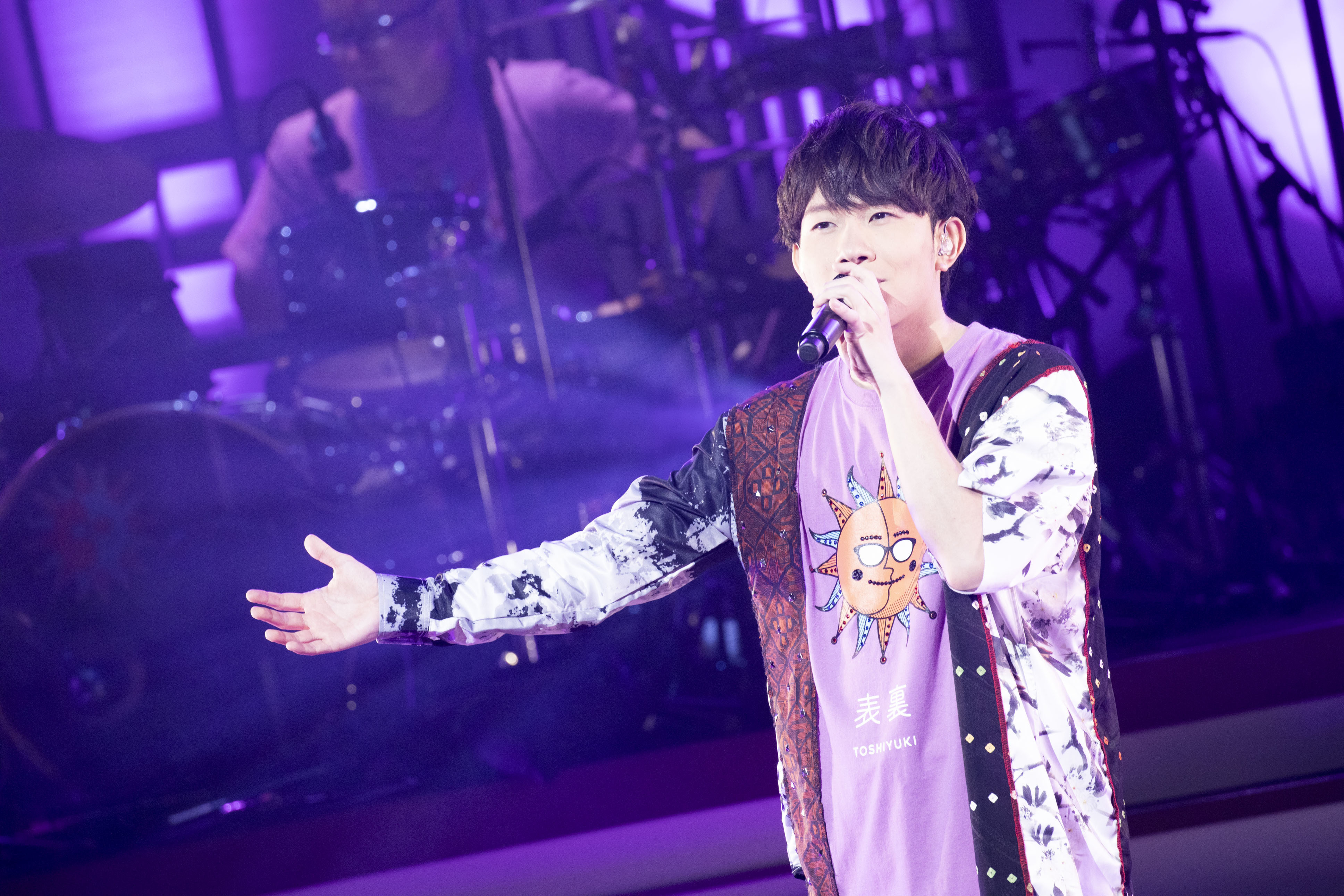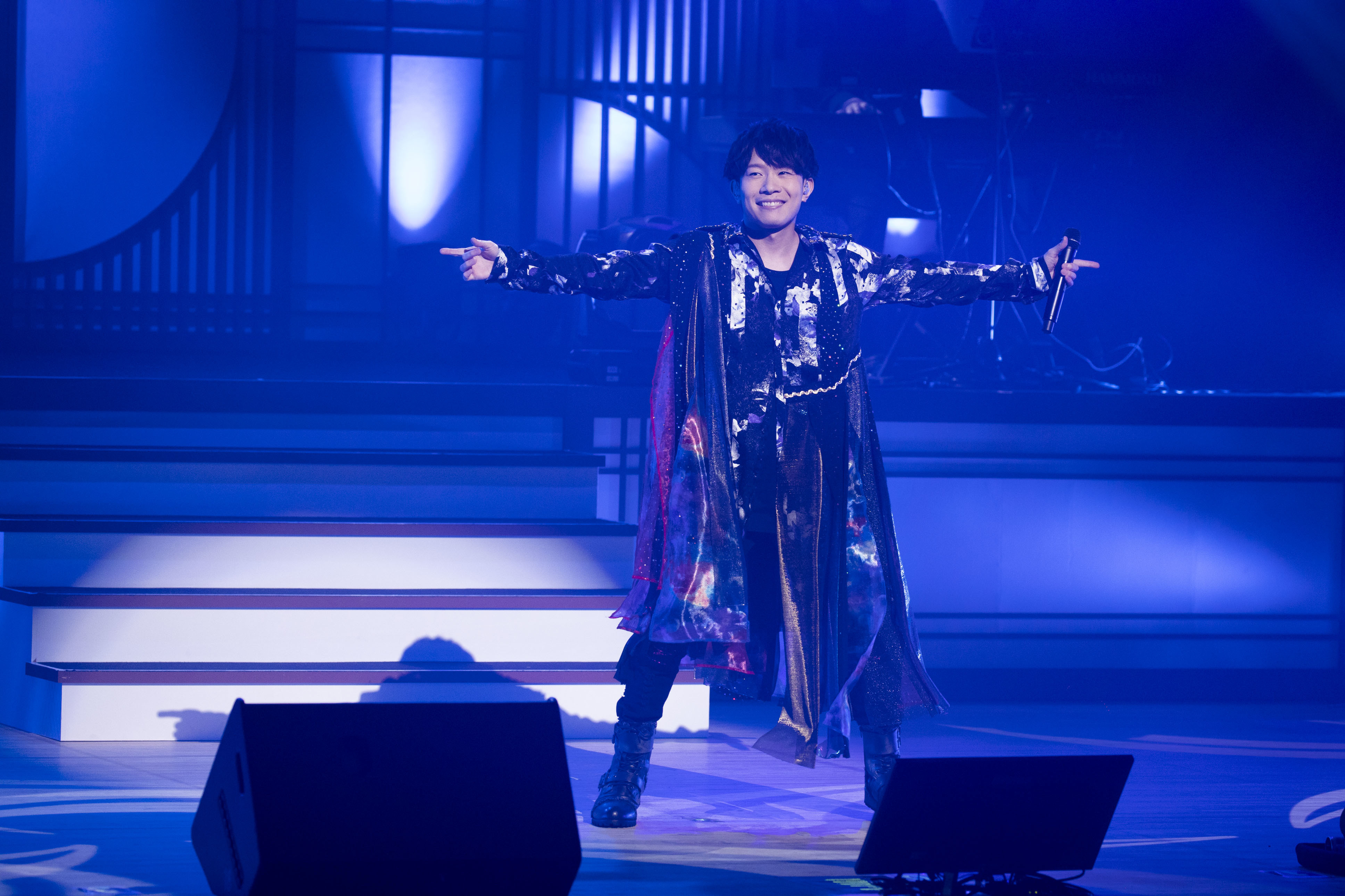 赤をテーマカラーにしたDAY1とは対照的に、青をテーマカラーにしたサックスブルーのジャケット、黒地に紫のオーロラグラデーションの入ったTシャツ姿で登場した豊永。