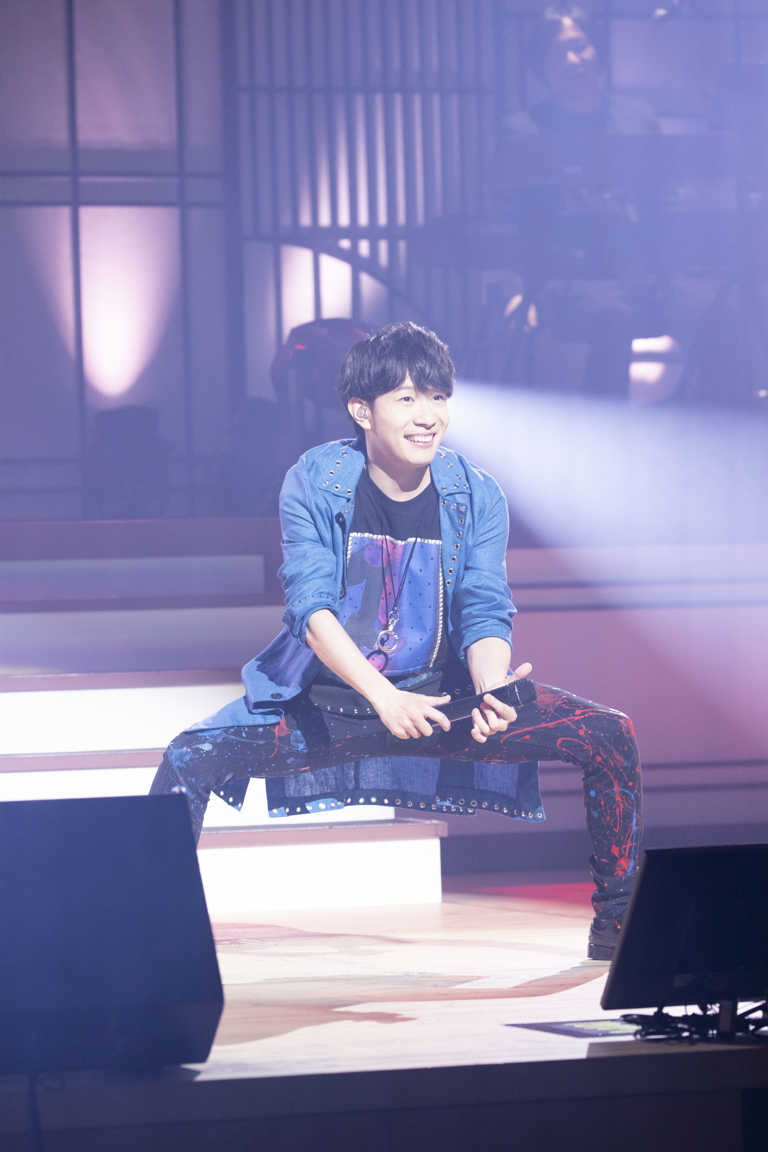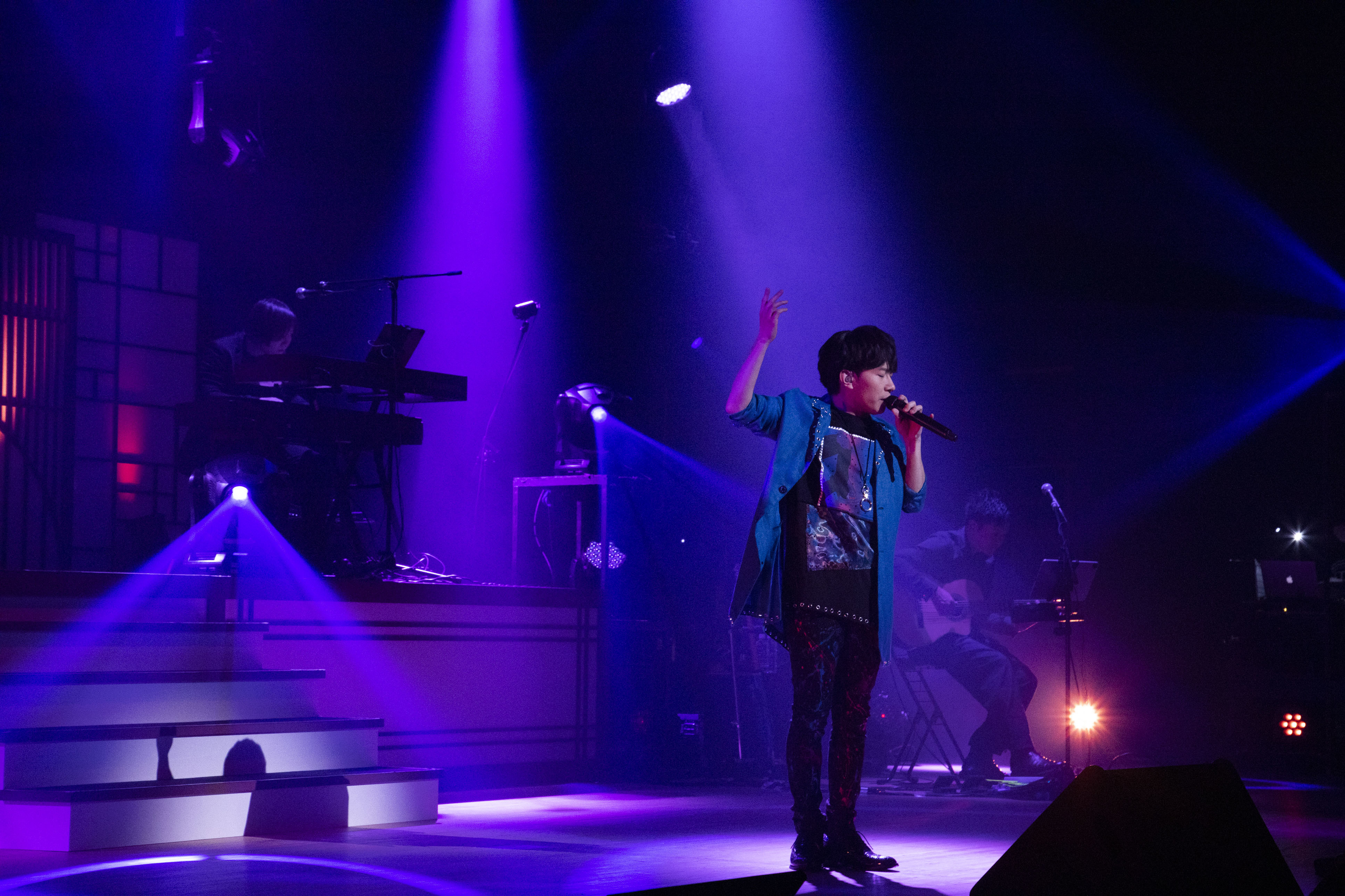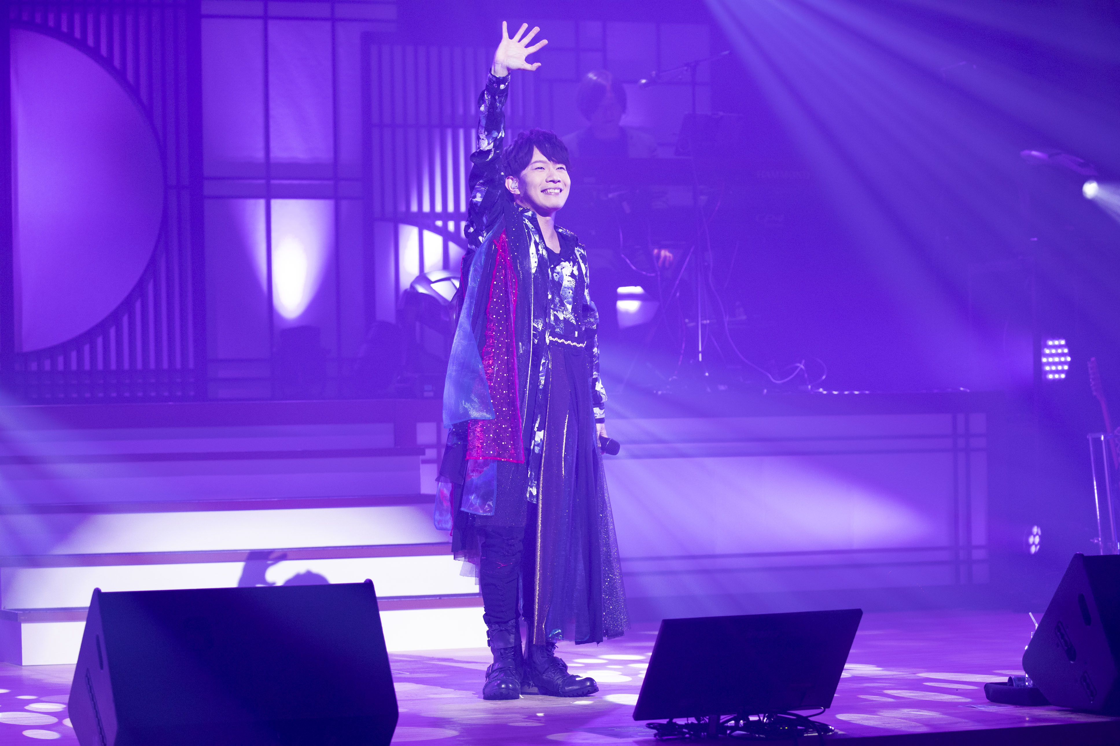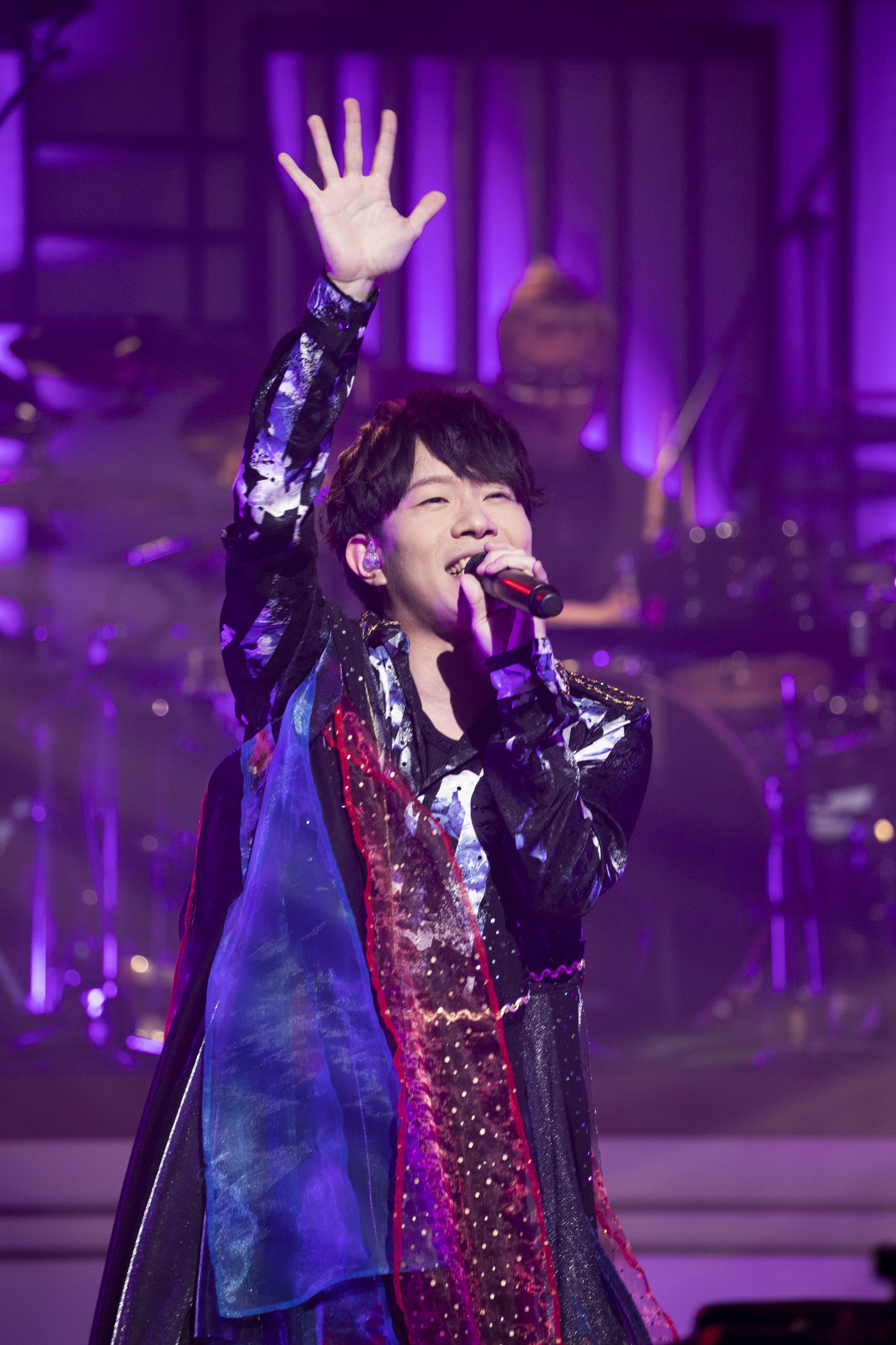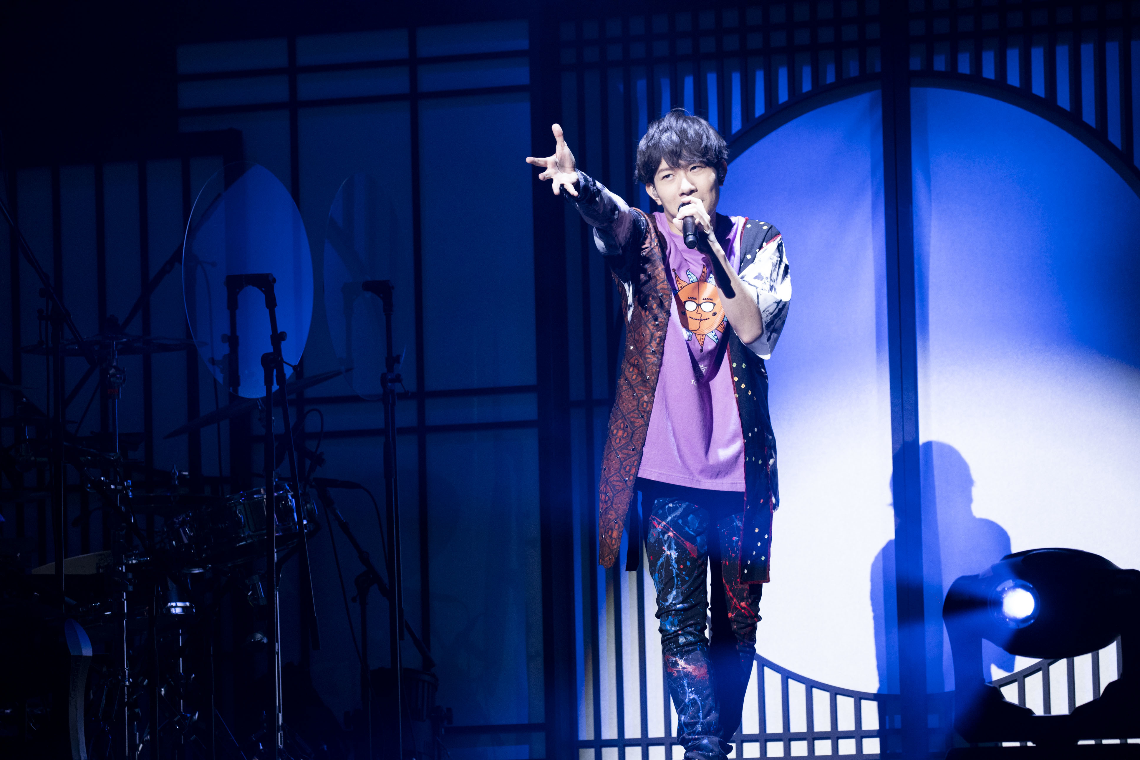 赤をテーマカラーにしたDAY1とは対照的に、青をテーマカラーにしたサックスブルーのジャケット、黒地に紫のオーロラグラデーションの入ったTシャツ姿で登場した豊永。