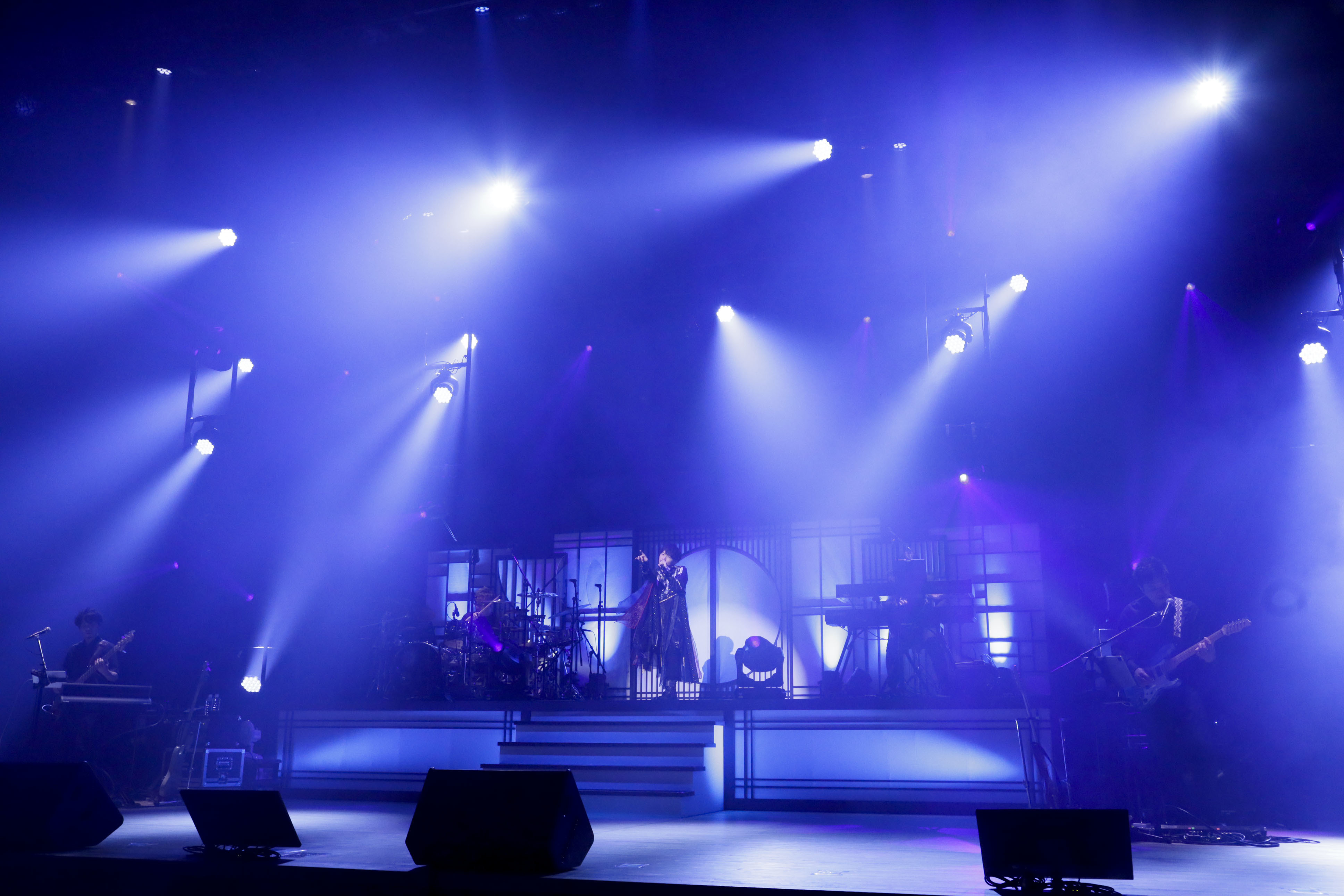 3曲目は『ACTORS』から「アサガオの散る頃に」。麻布汐が「次はこの、麻布汐が歌います! 皆さん、ぜひごゆるりとお聞きください」とご挨拶。三味線の調べに歪んだギターの音が重なる、渋めなアレンジとともに情熱的な歌声がサビへ続く期待感を募らせる。蝉の鳴き声が響くなか、夏空を思わせる爽やかな歌声を響かせた。
