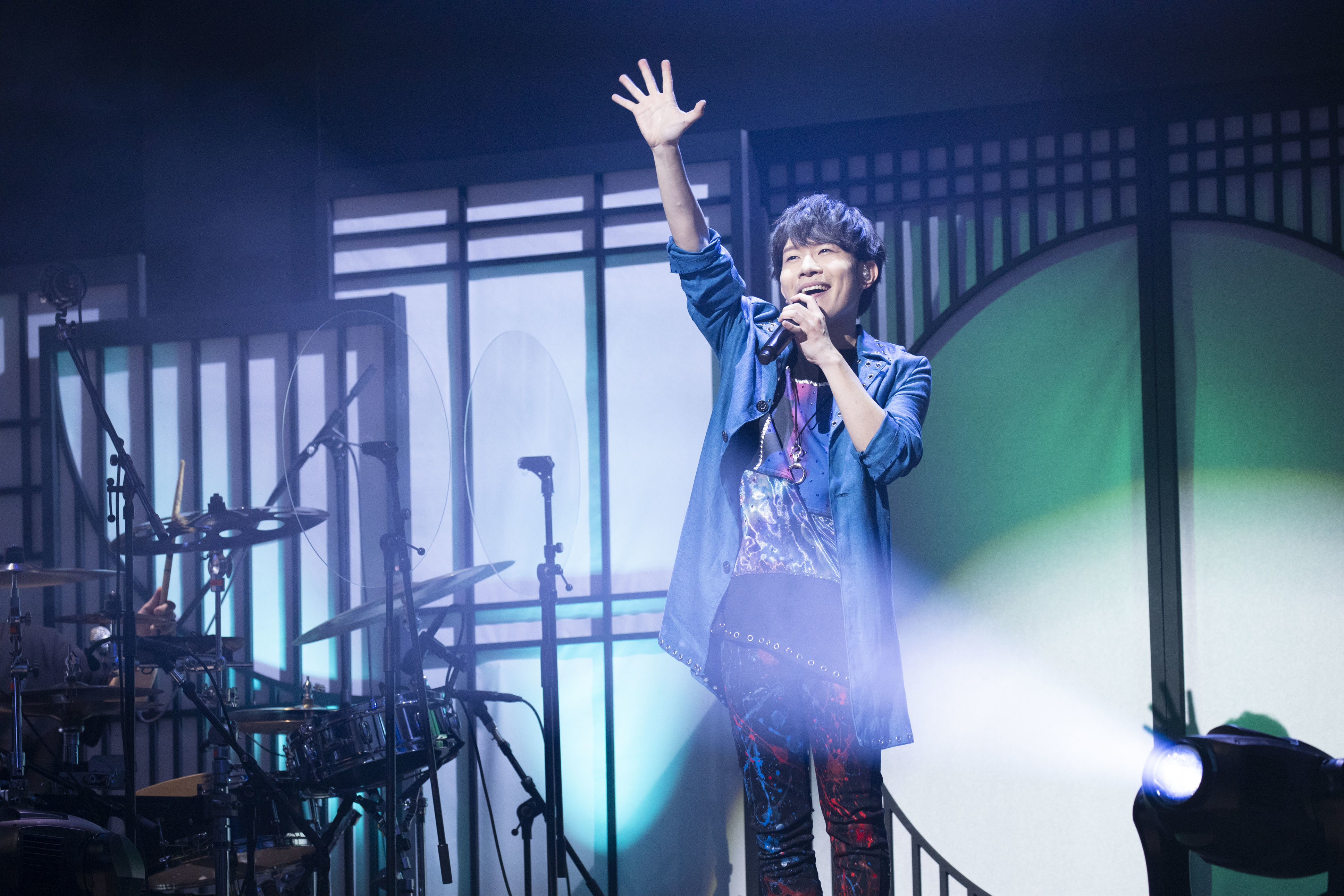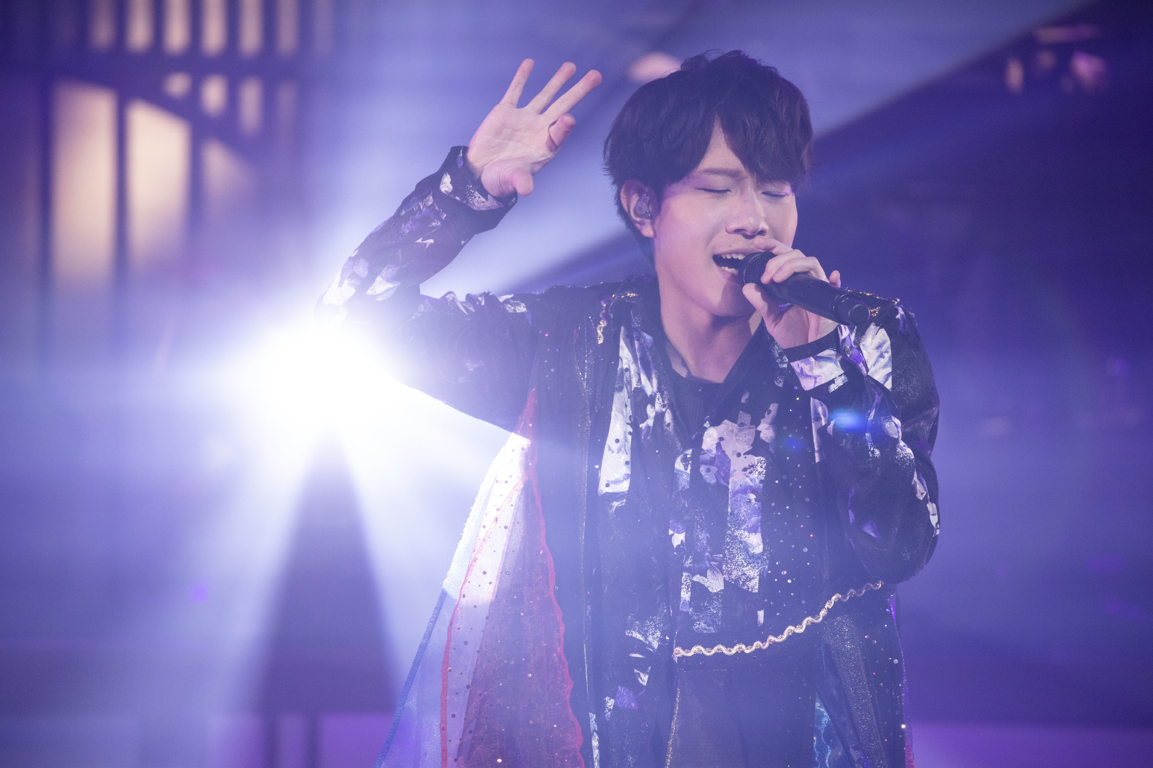 OP映像が明けると、DAY1と同様に青と赤や色々な紗が何層も重ねられたロングシャツで豊永が登場。今回はキャラソンライブということで、眼鏡を外した姿も新鮮だった。ライブの幕明けを飾ったのは、『DAIROKU:AYAKASHIMORI』のオープニングテーマ「妖言」。小暮邦明&矢野奨吾を迎えたDAY1のダンスとはまた一味違うパフォーマンスを披露した。疾走感あふれる和ロックを妖しく歌い、「表裏一体、キャラクターソングDAY! 始まります! もうガンガン行っちゃいますよー!」とエンジンをかける。