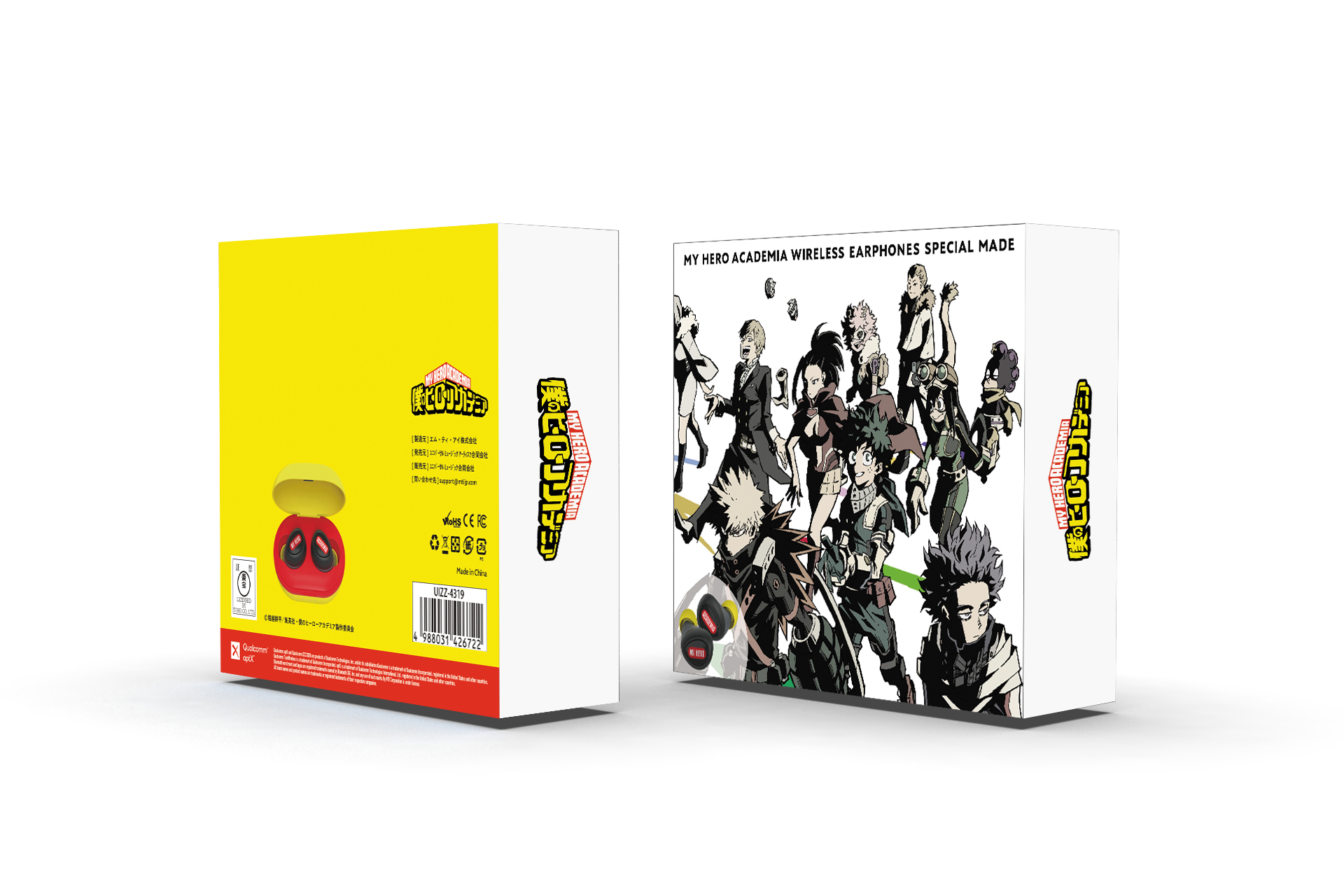 人気キャラクターのオールマイト(CV:三宅健太)、緑谷出久(CV:山下大輝)、爆豪勝己(CV:岡本信彦)、麗日お茶子(CV:佐倉綾音)、轟焦凍(CV:梶裕貴)、上鳴電気(CV:畠中祐)によるオリジナル音声コマンドを搭載・イヤホン操作時にキャラクターの音声で知らせてくれ、イヤホン本体や充電器のデザインも、オリジナルの特別仕様となっている。