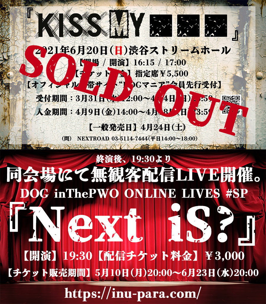 DOG inThePWOが6月20日(日)に渋谷ストリームホールで開催する有観客ワンマンライブ『KISS MY ■■■』のチケットが即日ソールドアウトしたことを受け、急遽、同日同会場で無観客配信ライブ『Next iS?』を開催することが発表された。