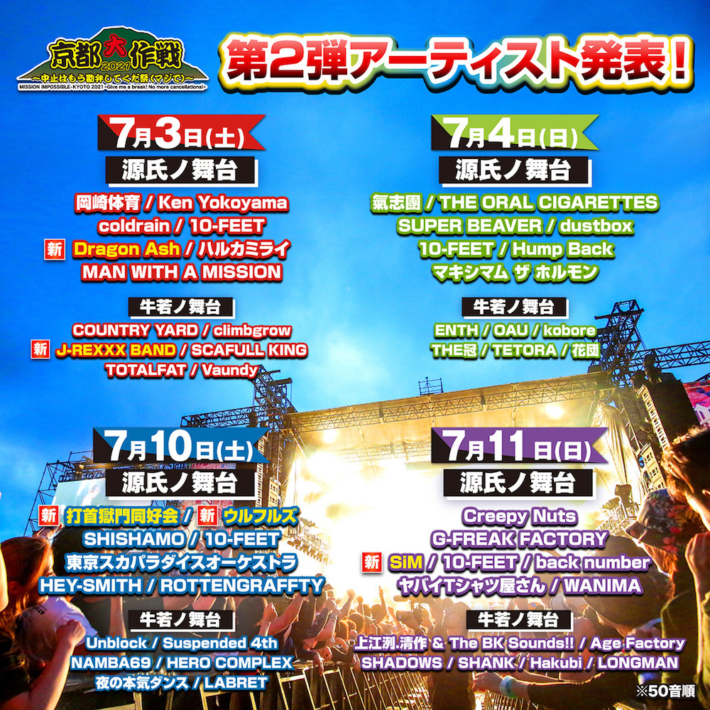 7月3日(土)、4日(日)、10日(土)、11日(日)の4日間にわたって京都府立山城総合運動公園 太陽が丘特設野外ステージで開催される10-FEET主催『京都大作戦2021~中止はもう勘弁してくだ祭(マジで)~』。その第2弾出演アーティストとして、既に発表されている44組に加え新たに5組が追加され、すべての出演者が発表となった。