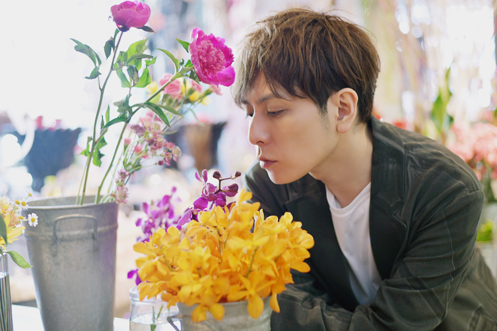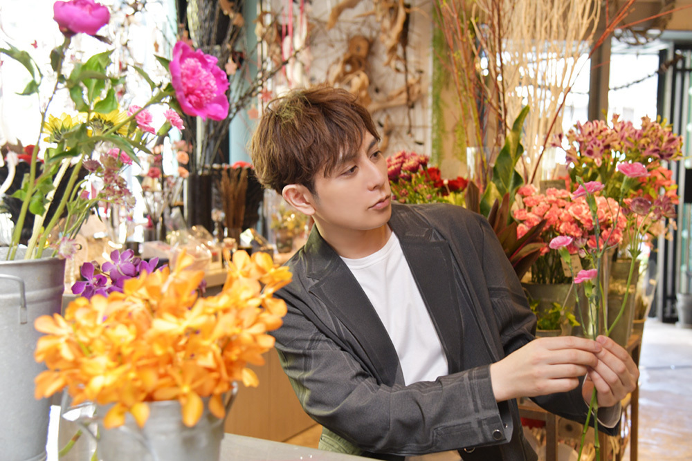 直筆メッセージ入り生写真用に、生花店での撮影に挑んだ堂珍は、「ピンク色の花って良い香りの花が多い」と話しながら、「匂いが断トツに良い!」と思わず口にしたほどのピンク色のカーネーションを前にナチュラルなポージングをするも、「花と仲良くなるのが難しい」と花と自分との撮影に苦戦していたそうだが、現場からは「ステキ!」と大好評だったという。