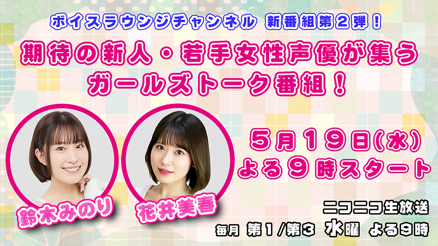 声優の鈴木みのり・花井美春がMCを務めるガールズトークバラエティ番組が本日5月19日(水)夜9時よりニコニコ生放送で放送開始となる。