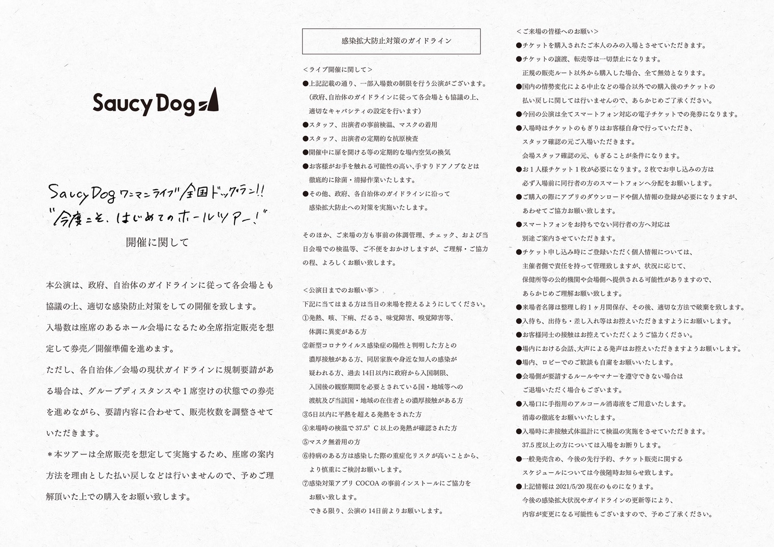 『Saucy Dog ワンマンライブ 全国ドックラン!!“今度こそ、はじめてのホールツアー!』と題して開催される今ツアーは、9月29・30日(水・木)東京LINE CUBE SHIBUYA 2Daysを皮切りに12月2日(木)東京ガーデンシアターまで全国10箇所12公演を廻るホールツアーとなっている。チケットの先行予約等のスケジュールは、オフィシャルホームページをチェックしよう。