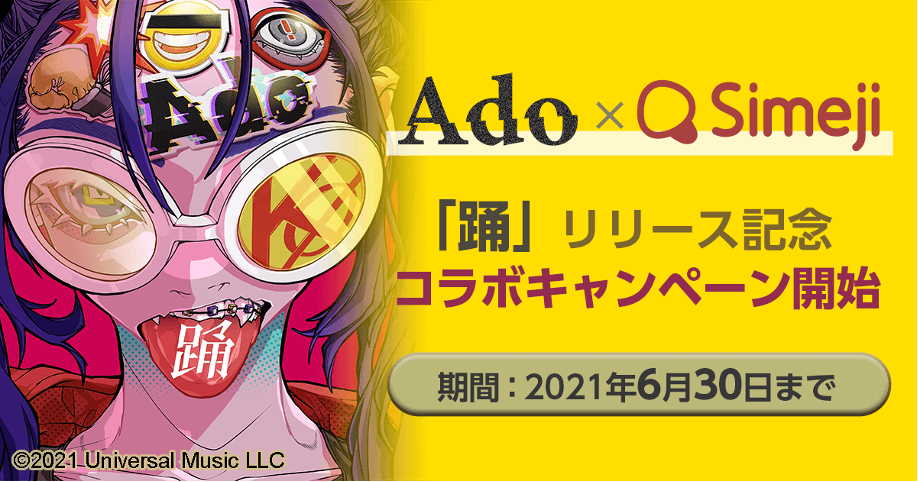 Adoが日本語入力&きせかえ顔文字キーボードアプリ「Simeji」(iOS、Android版)との期間限定コラボを本日・5月21日(金)からスタートした。