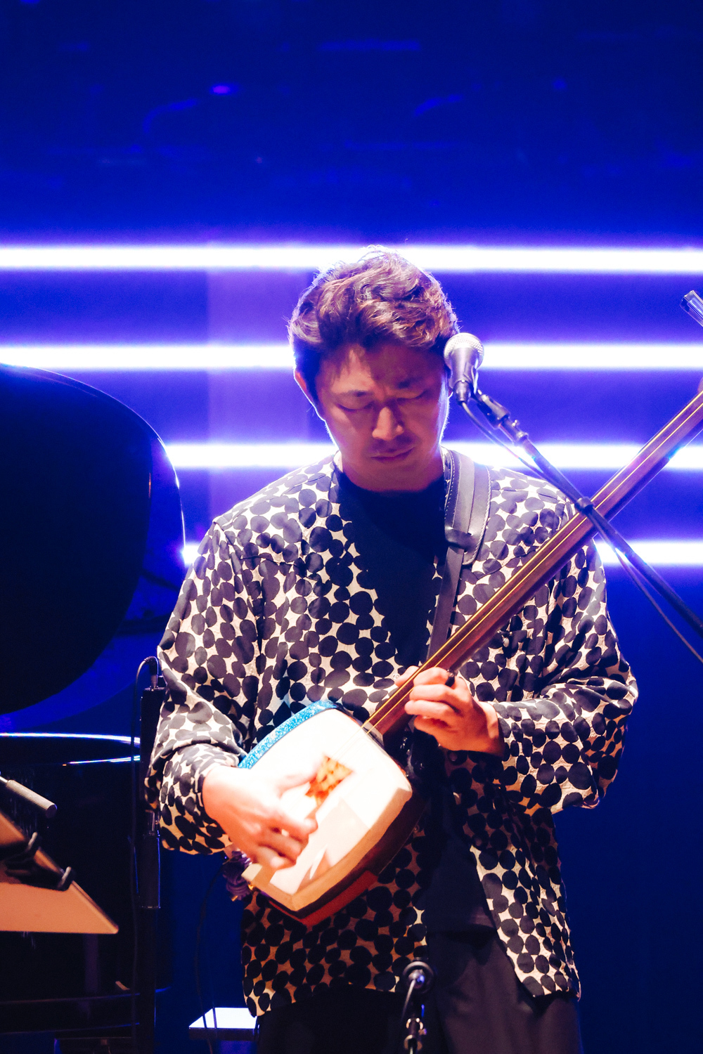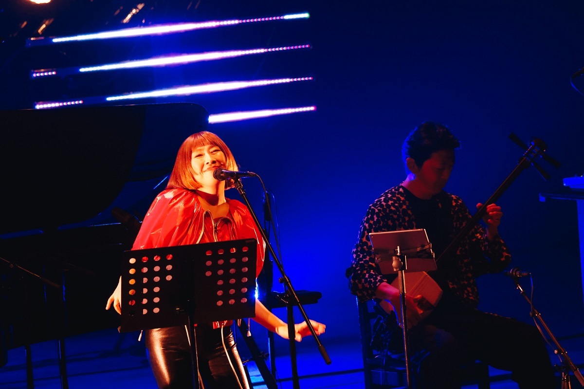 やのとあがつまの音楽を、無理矢理ひと言で言ってしまえば“デジタルビートと民謡の融合”ということになると思うのだけれど、それは一般的なデジタルビートの音楽に慣れ親しんでいる人にも民謡が大好きな人にとってもちょっと不思議な感じのする音楽ではあるだろう。矢野がMCで説明した表現に倣えば「今までに聴いたことのない、民謡なんだけど大幅に違う」音楽だから、そのイメージを視覚化すると宇宙的ということになるのかもしれない。やのとあがつまの衣装は黒を基調にしたもので、その後方でデジタル信号的な照明が繰り広げられるので、見ている印象としては“未知との遭遇”感も漂う。が、音楽に意識を向ければ、重心の低いビートに乗って、矢野のピアノと上妻の三味線がリズムを絡め合う。そう。ここでは、メロディやコードが積み重ねられるのではなく、二人の演奏のうねりが絡み合って、そこに矢野の朗々とした、時に呪文を唱えるような歌が乗っかる。あるいは、上妻の張りのある歌がうねる演奏の中を突き抜けていく。前半は、それでも歌の比重が比較的大きい曲が続いたが、上妻の「賑やかな曲を」という言葉を受けて始まった「Rose Garden」で一気にヒートアップ。逃げるのと追いかけるのを入れ替わりながら戯れ合う2匹の猫のように、二人が繰り出す音が絡み合いながら転がっていく。その展開のスリリングな心地よさを満喫したところで第一部のステージが終了した。