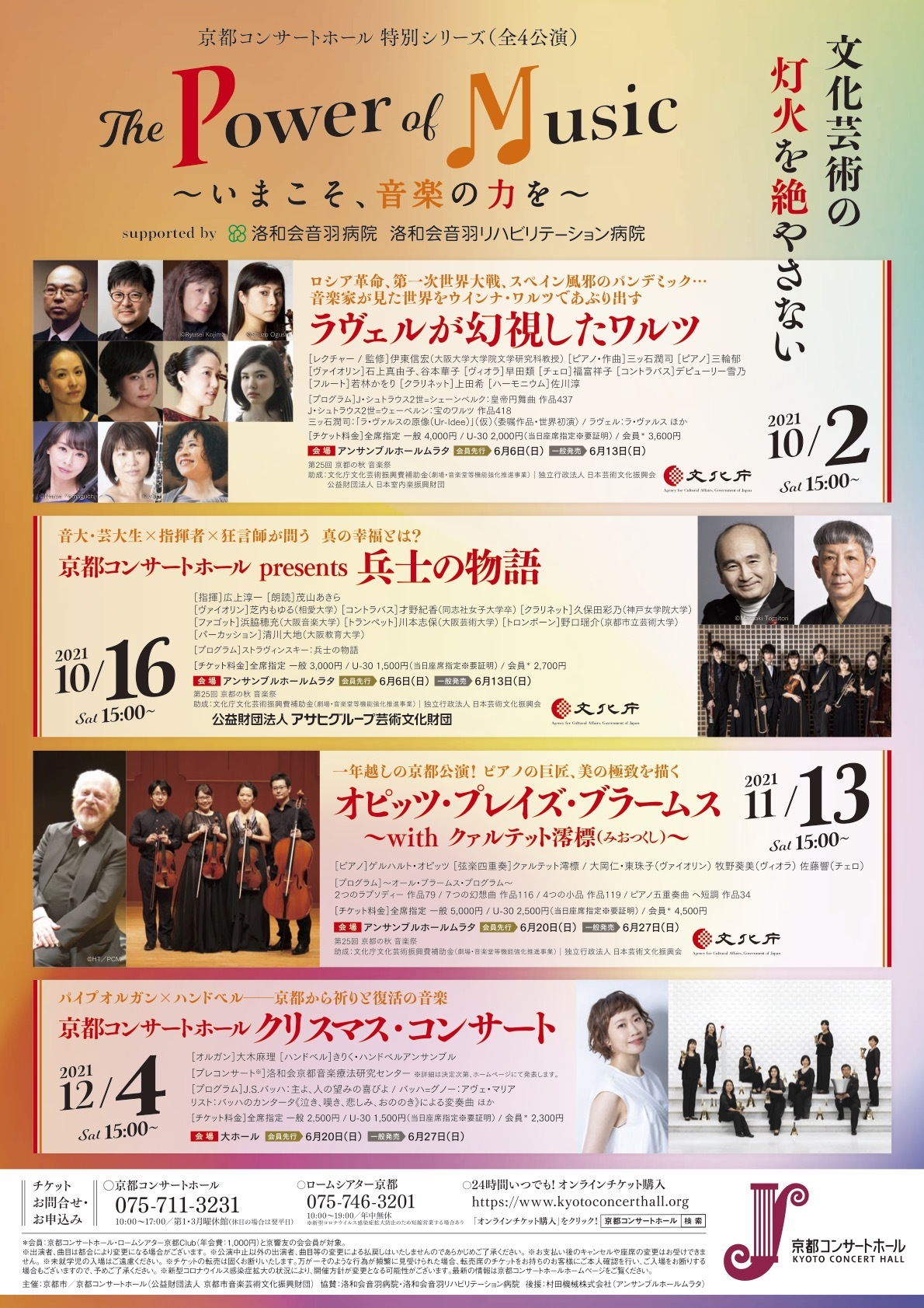 4つのコンサート全てに「コロナに屈しない」のメッセージが込められており、また若手や学生を起用し、30歳以下に適用される割引鑑賞チケットを用意するなど、若年層への支援も積極的に行っていく。