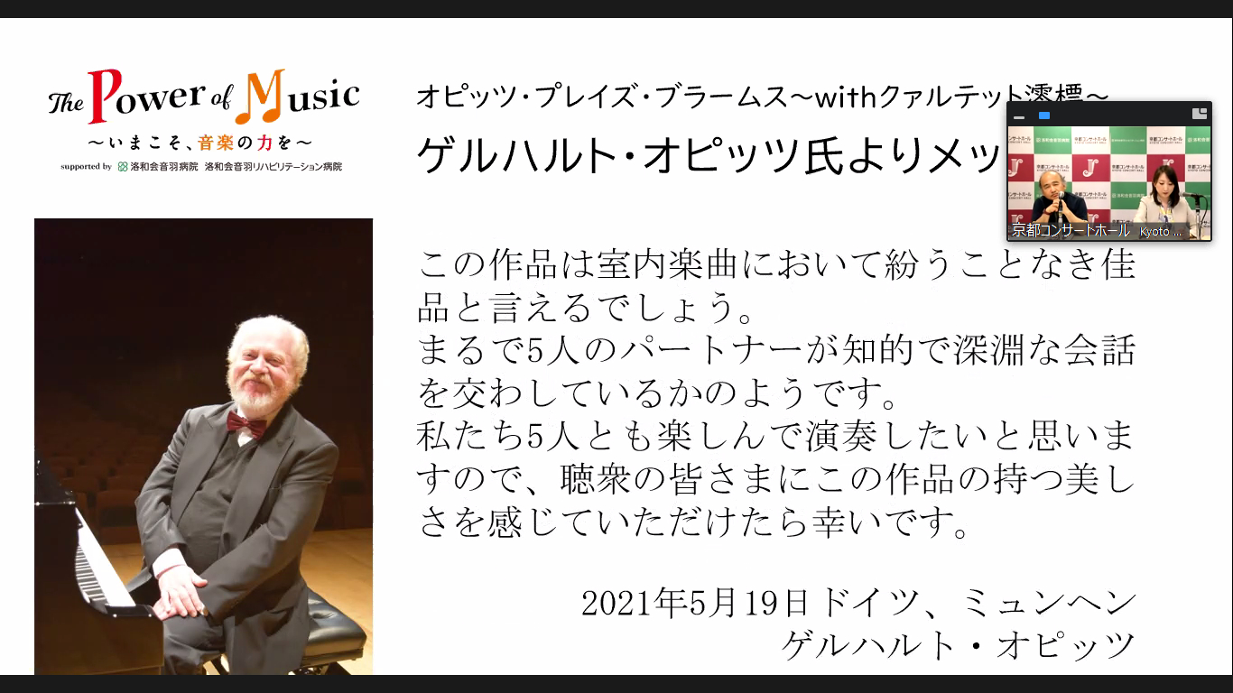 また、同公演においても若手音楽家を起用。2006年に相愛大学と京都市立芸術大学の学生で結成された、クァルテット澪標が「ピアノ五重奏曲」の演奏に参加する。広上館長は「オピッツ先生のピアノは、一音聴いただけで幸せな気持ちになれる。人柄も温厚なので、共演を通して世界的ピアニストとの交流の場となれば嬉しい」と語った。