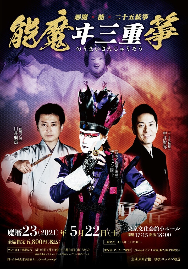 2021年5月22日(土)、東京文化会館小ホールにて、 山井綱雄(能舞/謡)、 デーモン閣下(朗読/歌唱/脚本)、 中井智弥(二十五絃箏)による芸能舞台「悪魔×能×二十五絃箏『能魔ヰ三重箏(のうまいさんじゅうそう)』」が上演された。この度、本公演の映像を使用したティザー動画が解禁となった。