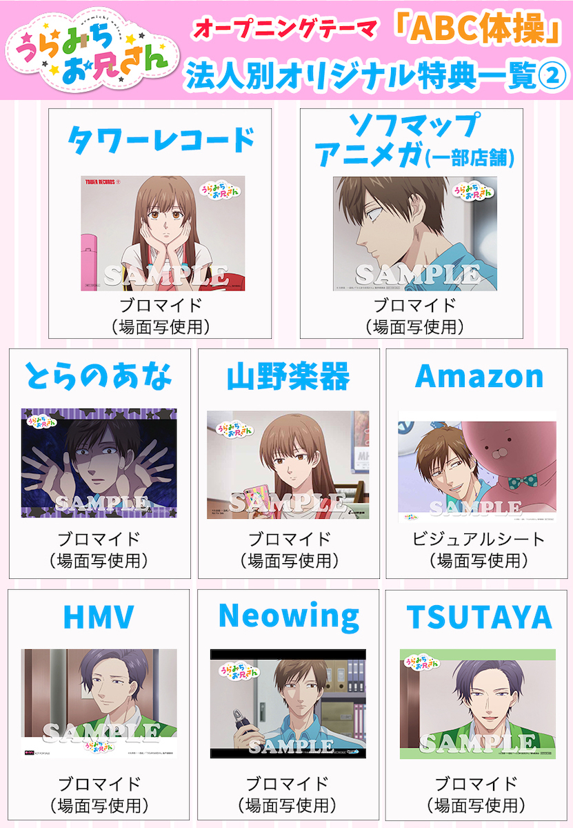 アニメの場面写真を使用した法人別オリジナル特典と、原作・久世 岳先生の新規描き下ろしイラストを使用したOP&ED同時購入特典のスリーブケース絵柄も公開されている。