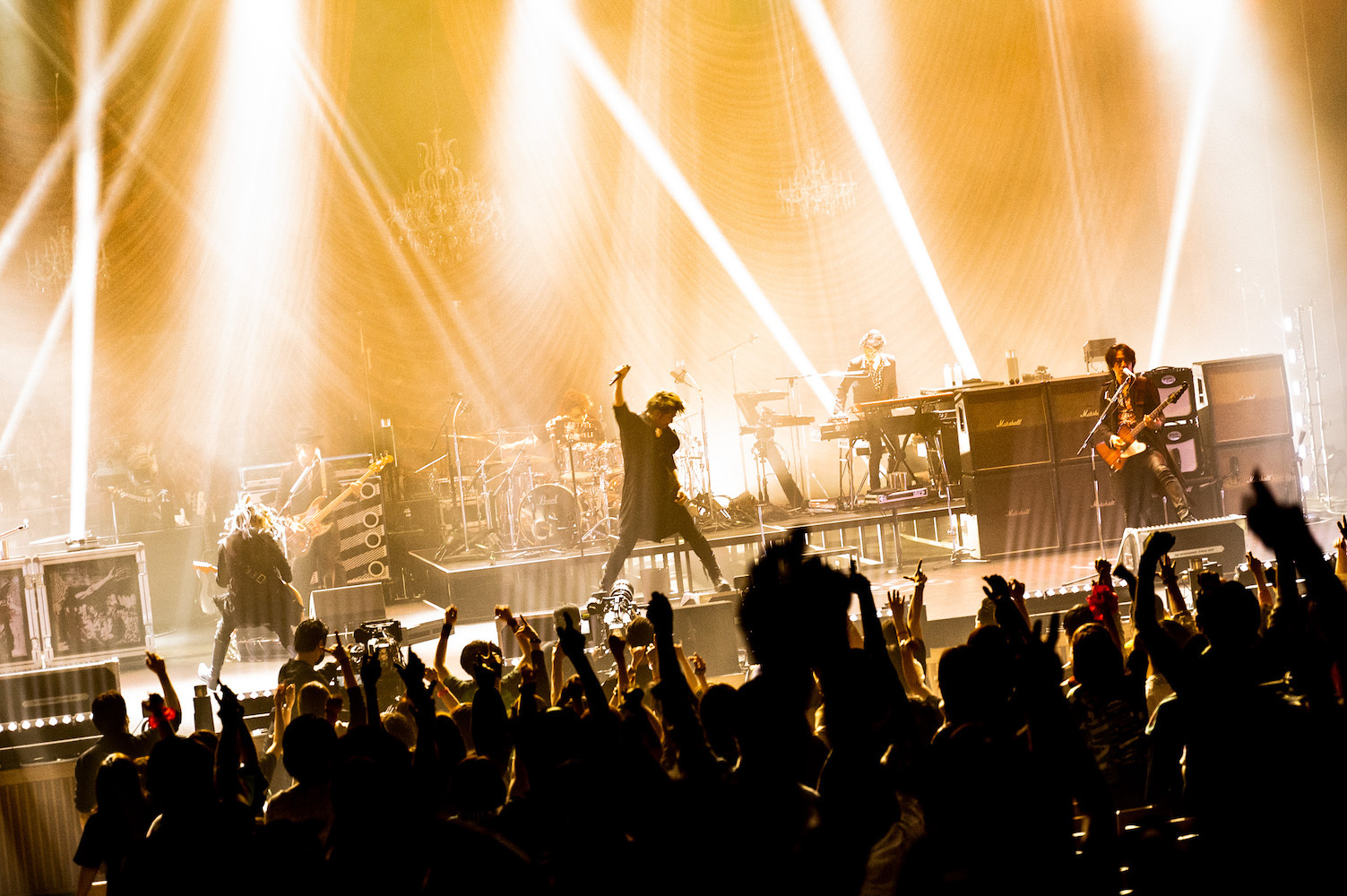 GLAYが今年発表したテーマ「THE ENTERTAINMENT STRIKES(エンターテイメントの逆襲)」の名の下、半年ぶりとなるファンとの再会ライブが始まった。1曲目は「MUSIC LIFE」。デビュー20周年に向け、初めて亀田誠治と組んだ13枚目のアルバム『MUSIC LIFE』に収録された、GLAYの中でも重要なアルバムのタイトル曲の壮大なサウンドで幕が上がった。TERUの「行くぜ渋谷」というファンがいるからこその掛け声が、半年ぶりの再会の重さを感じさせてくれる。続いては「ビリビリクラッシュメン」が披露され、ヘビーなギターリフと共にメンバーから発せられる熱気で、会場のボルテージはどんどん上がっていく。その勢いのまま強烈なスネアロールから始まる「absolute“ZERO”」。サビではいつも以上にTAKURO、HISASHI、JIROが強くコーラスをする姿が印象的であった。