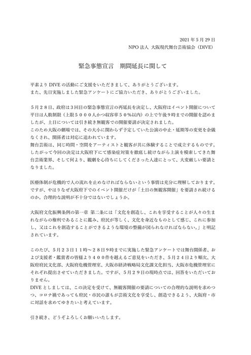 この事態を受けて、大阪を拠点とする劇団で構成される組織「大阪現代舞台芸術協会(DIVE)」では、公式サイトに「緊急事態宣言 期間延長に関して」というタイトルで、「大阪府文化振興条例の第一章 第二条」を引用しながら、現在の大阪府の自粛要請に疑問を呈する声明を発表した。また同時に、表現者・一般観客を問わず、幅広い層を対象にしたWEBアンケートを実施し、そこで集まった約300件の意見を、5月25日に大阪府に提出。アンケートにはその後も声が集まり、28日9時の時点で400件を超えたという。