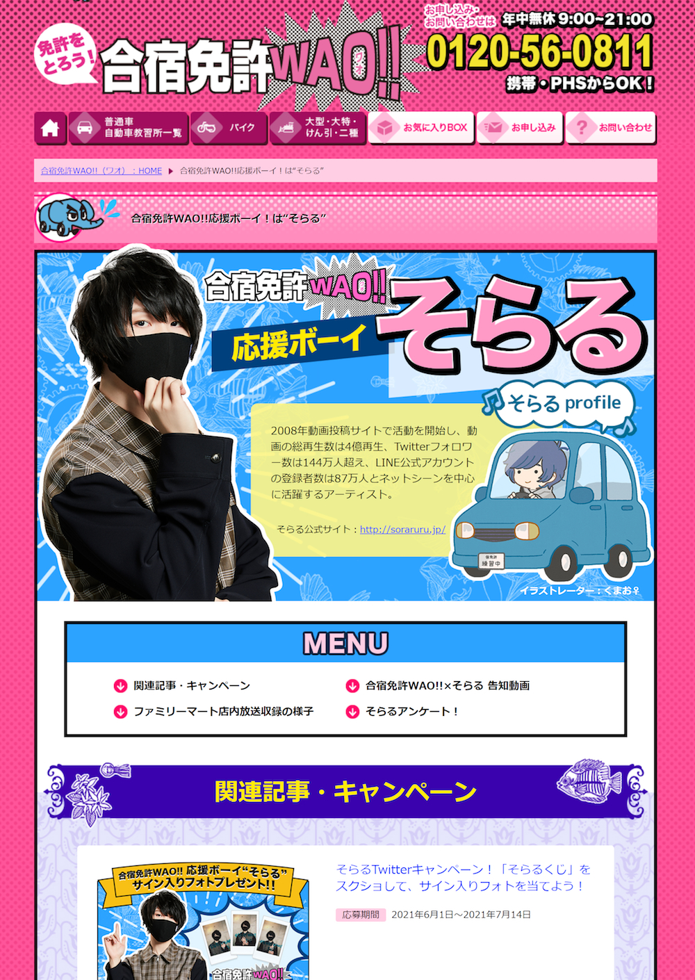 そらるが合宿免許の予約サイト「合宿免許WAO!!」の応援ボーイに就任した。