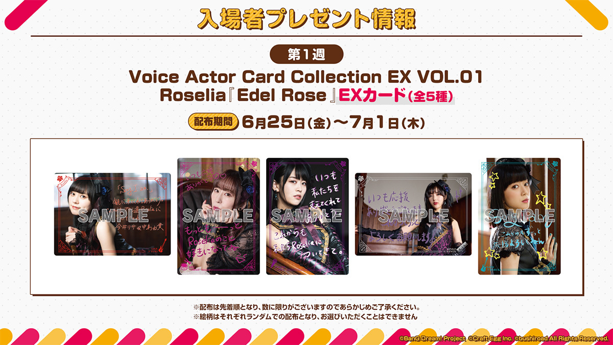 第1週である6月25日(金)からは「Voice Actor Card Collection EX VOL.01 Roselia『Edel Rose』EXカード(全5種)」が配布される。絵柄はランダム配布で、先着順なので数に限りがあるとのこと。