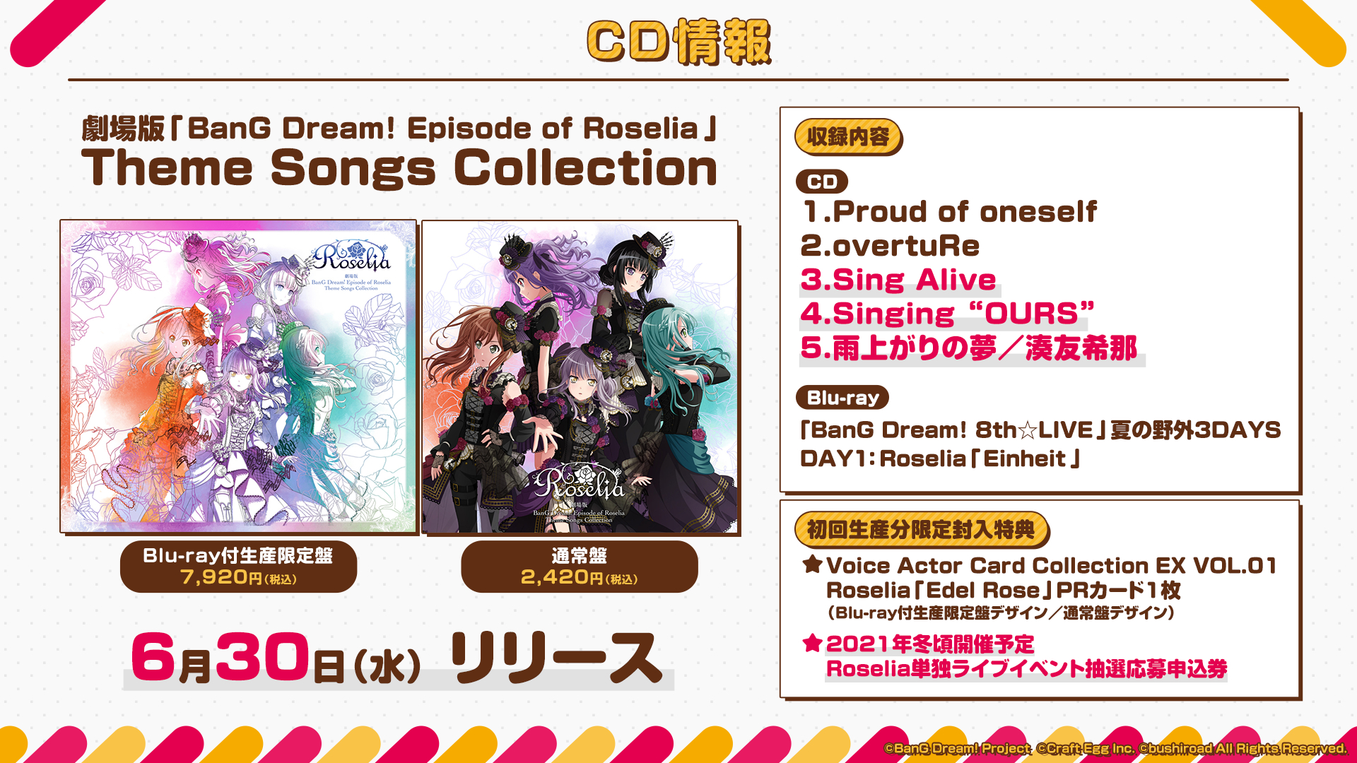 このほか、6月30日(水)に発売のミニアルバム『劇場版「BanG Dream! Episode of Roselia」Theme Songs Collection』の収録曲や特典なども解禁された。初回生産分限定封入特典に『2021年冬頃開催予定Roselia単独ライブイベント抽選応募申込券』が追加され、ファンにはマストバイのアルバムとなりそうだ。