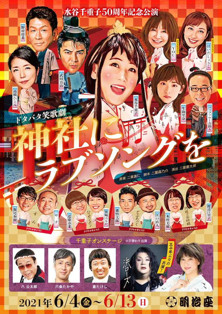 6月4日(金)より東京・明治座にて、 水谷千重子が座長を務める同公演は、 芝居ステージ『ドタバタ笑歌劇 神社にラブソングを』と、 歌謡ショーの『千重子オンステージ』の2部で構成される。