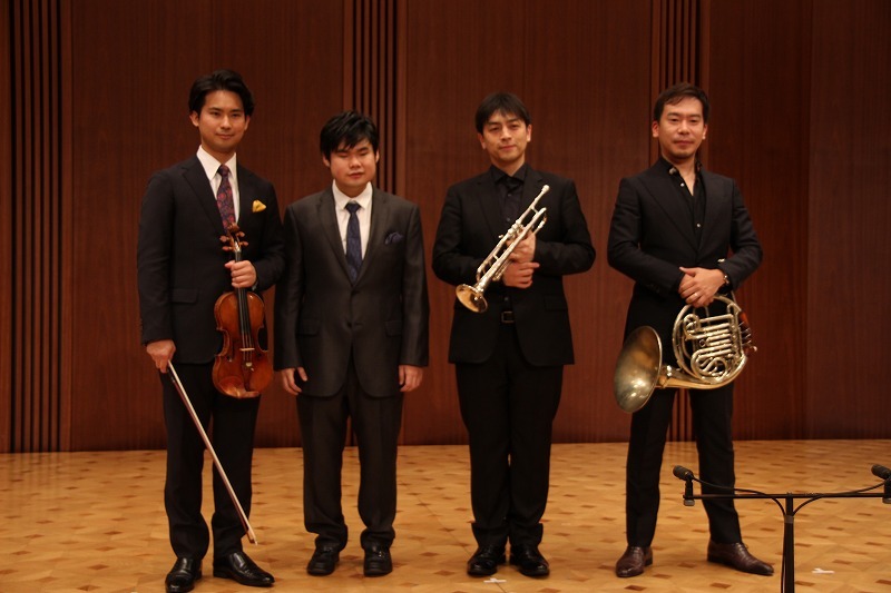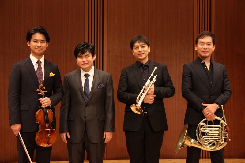 音楽祭『サントリーホール ARKクラシックス』に出演する(左から)バイオリニストの三浦文彰、ピアニストの辻井伸行、トランペッターの佐藤友紀、ホルン奏者の福川伸陽