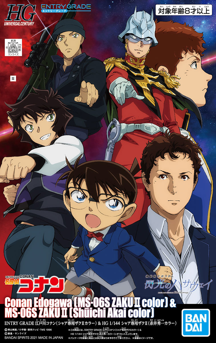 『名探偵コナン 緋色の弾丸』、『機動戦士ガンダム 閃光のハサウェイ』の公開を記念したコラボレーション商品、「ENTRY GRADE 江戸川コナン(シャア専用ザクⅡカラー)」&「HG 1/144 シャア専用ザクⅡ(赤井秀一カラー)」 (3300円 税込)が発売決定した。