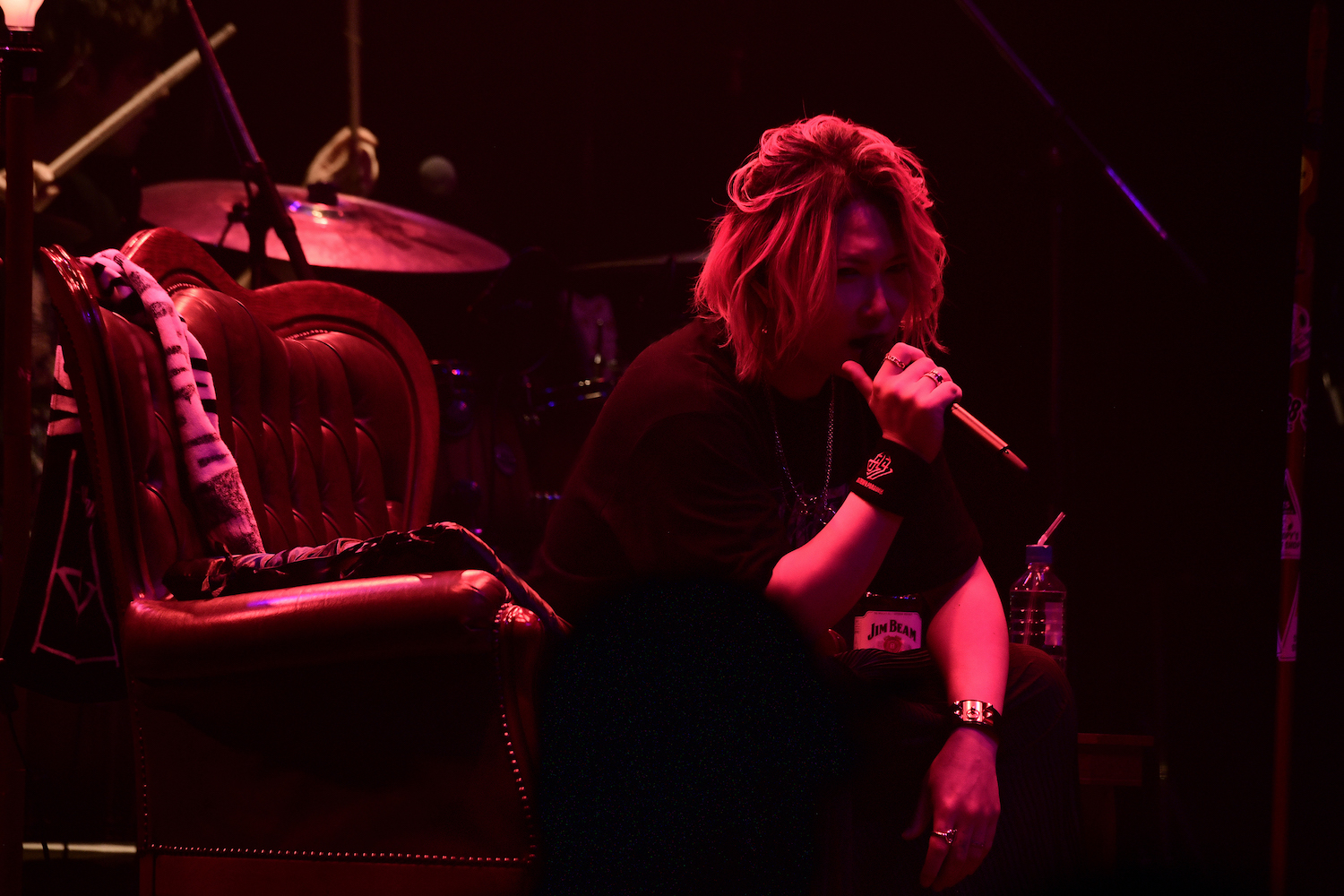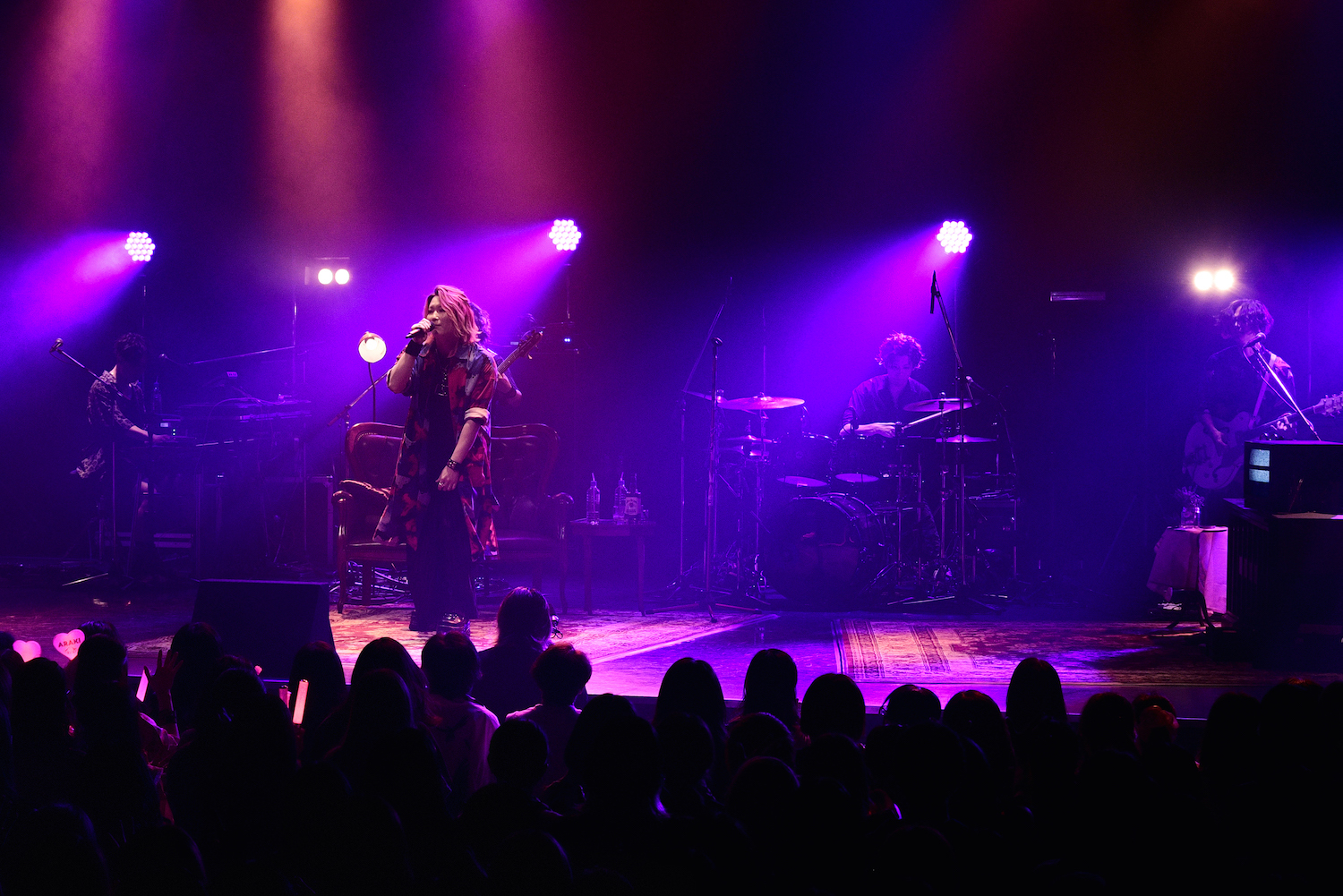 ソファやサイドテーブルが置かれ、オリエンタル柄のラグが敷かれたステージ。のちのMCであらきが言ったように、「日常っぽいと見せかけてこの世にないような空間」が、まさに演出されている。そこにまず現れたのは、ギター&キーボード&プログラミング・K.F.J、ギター・鳴風、ベース・Ryosuke、ドラム・裕木レオン。あらきをがっちりと支えるバンドメンバーだ。4人が生み出す音の渦の正体は、6月16日リリースの全曲オリジナルアルバム『UNKNOWN PARADOX』の幕開けを飾る「DOXA」。なんてドラマティックなんだ。