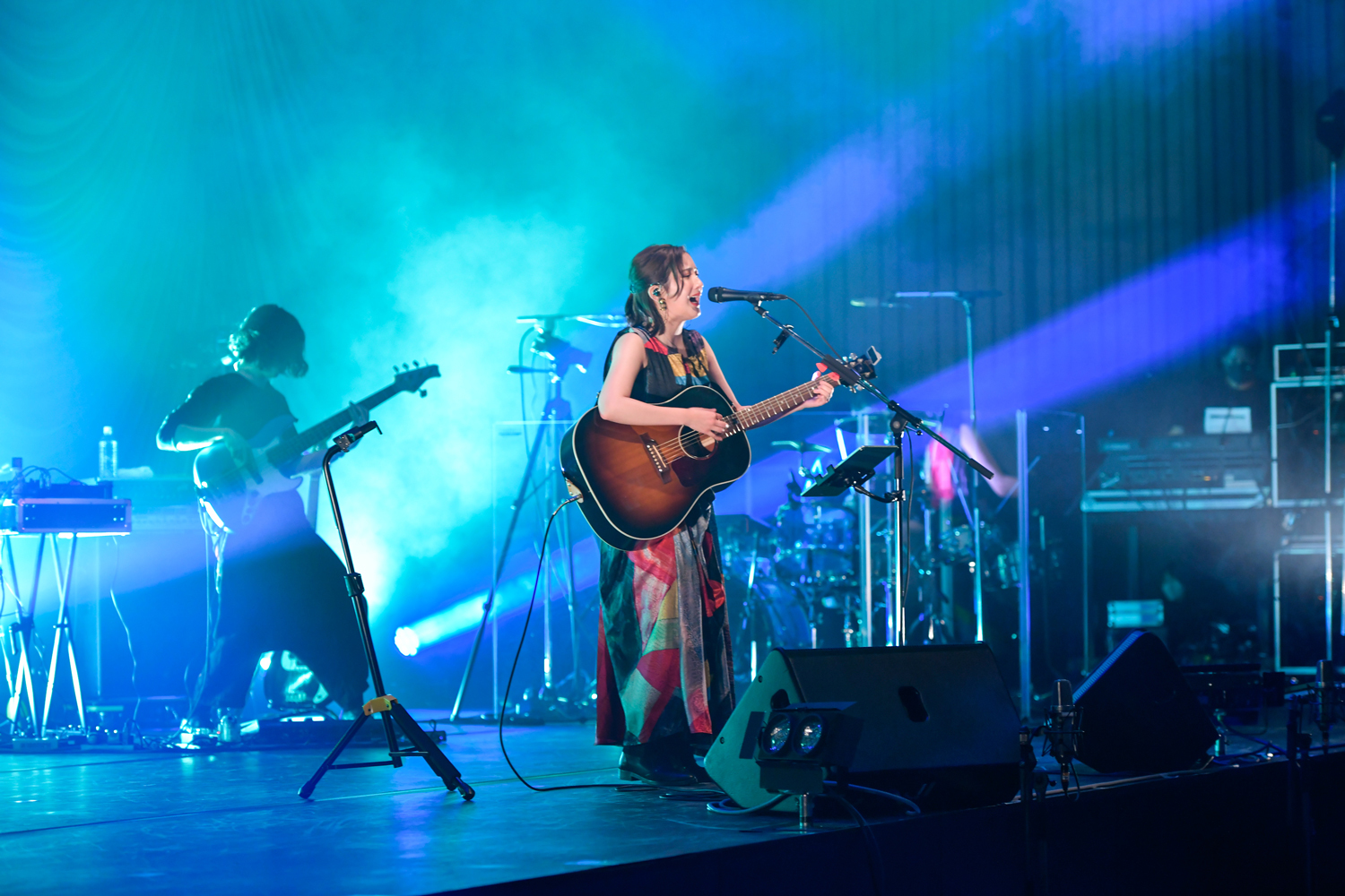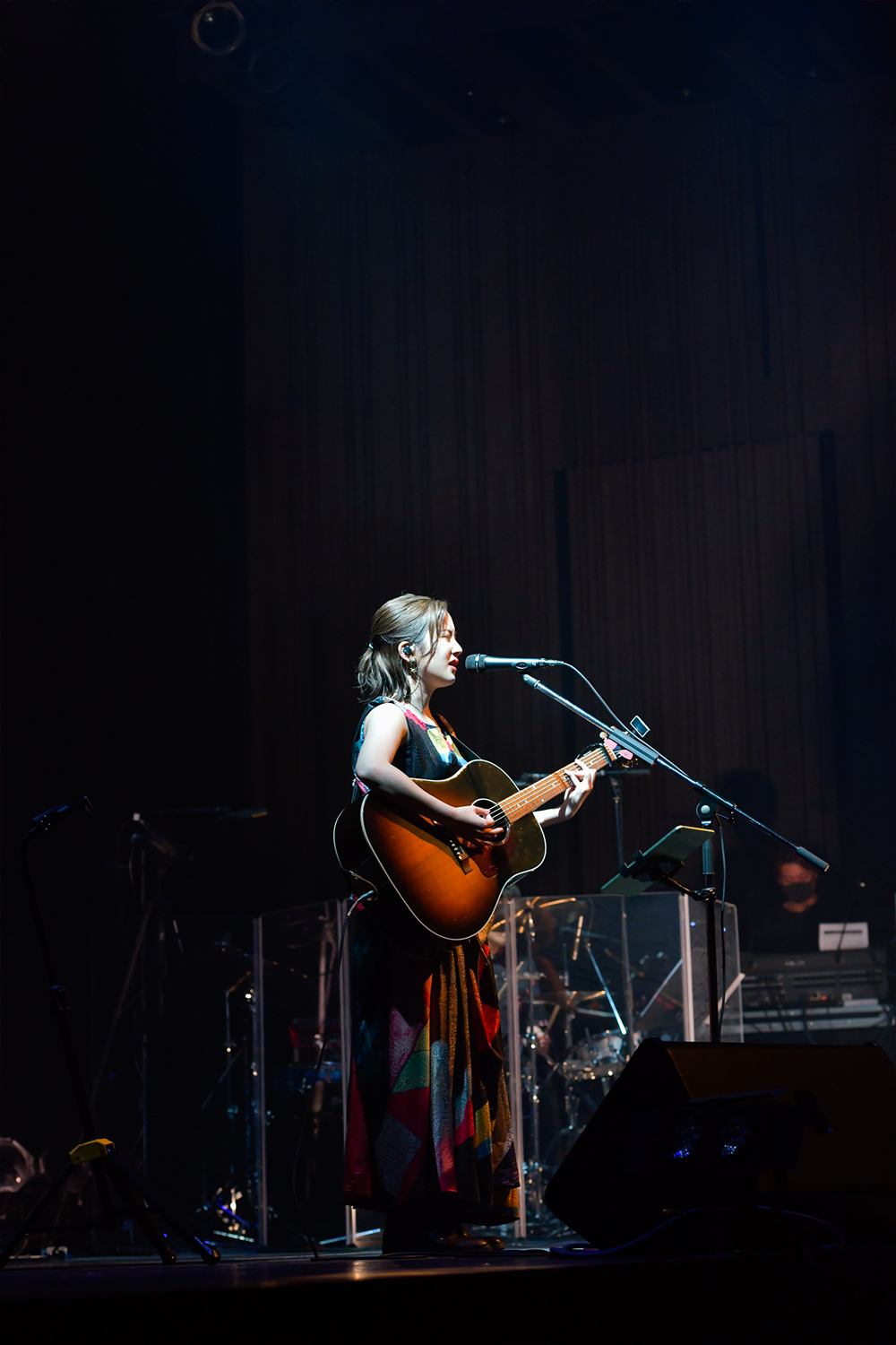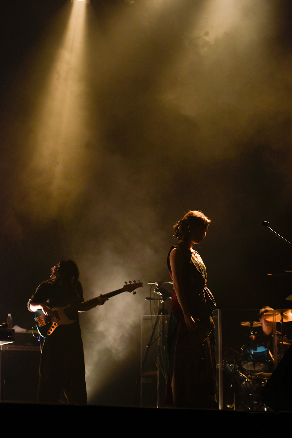 椅子の上に胡坐をかくいつものスタイルで「色々と話したいことあるんだけど…」と語り始める。<人生は選択の連続でできた物語>と、このライヴを開催するにあたっての彼女が提示したメッセージの中の一節についてを、改めてこの日駆け付けたファン、そしてこのライヴを配信で楽しんでいるファンに説明する。「正しい正しくないは一人一人の中にあって、人々はいくつもの選択をして生きていく。一番いけないのは<選択>しないこと」——そう語り「選択」を、まるでひと言ひと言を確認するように丁寧に歌い、届ける。メジャーデビュー曲「バースデー」は、太い芯を感じるまっすぐな歌声が、会場に響き渡る。赤い照明が妖艶さを感じさせてくれる「金魚」は、打ち込みからよこやまこうだいの太いベースがのっていきグル―ヴを作り、強力なバンドアンサンブルが歌を更に前に押し出す。
