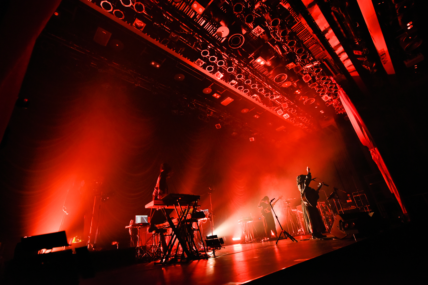 「楽しんでいってください!」と客席に声をかけ「Answer」を歌い始める。ダンサーが登場し、湯木の心の内を映し出すような踊りを披露し、バンドの音とコーラス、そして歌とが完全にシンクロし圧巻の世界を作りだす。湯木がどん底の時期を経て、一歩前に進んだ証でもある「スモーク」では、涙ぐみながら歌を紡いでいく。<君は強い 君は強い>という歌詞はまるで自分自身に言い聞かせているようで、客席に感動が広がっていく。「網状脈」では<動き続けては18年>という歌詞を<23年>と歌い、この日、この時を心から信頼している素晴らしいバンドと音を響かせることができる喜びを、ソロパートを回しながら感じているようだった。ギター・バンマス西川ノブユキ、キーボード3台を駆使しアグレッシヴなプレイを見せるベントラーカオル、ベースよこやまこうだいとドラム奥村大爆発のリズム隊が作り出す太いリズム、楠美月のコーラス…湯木が今描きたい世界、出したい音を共に表現してくれる頼もしいパートナーに囲まれて、幸せそうだ。