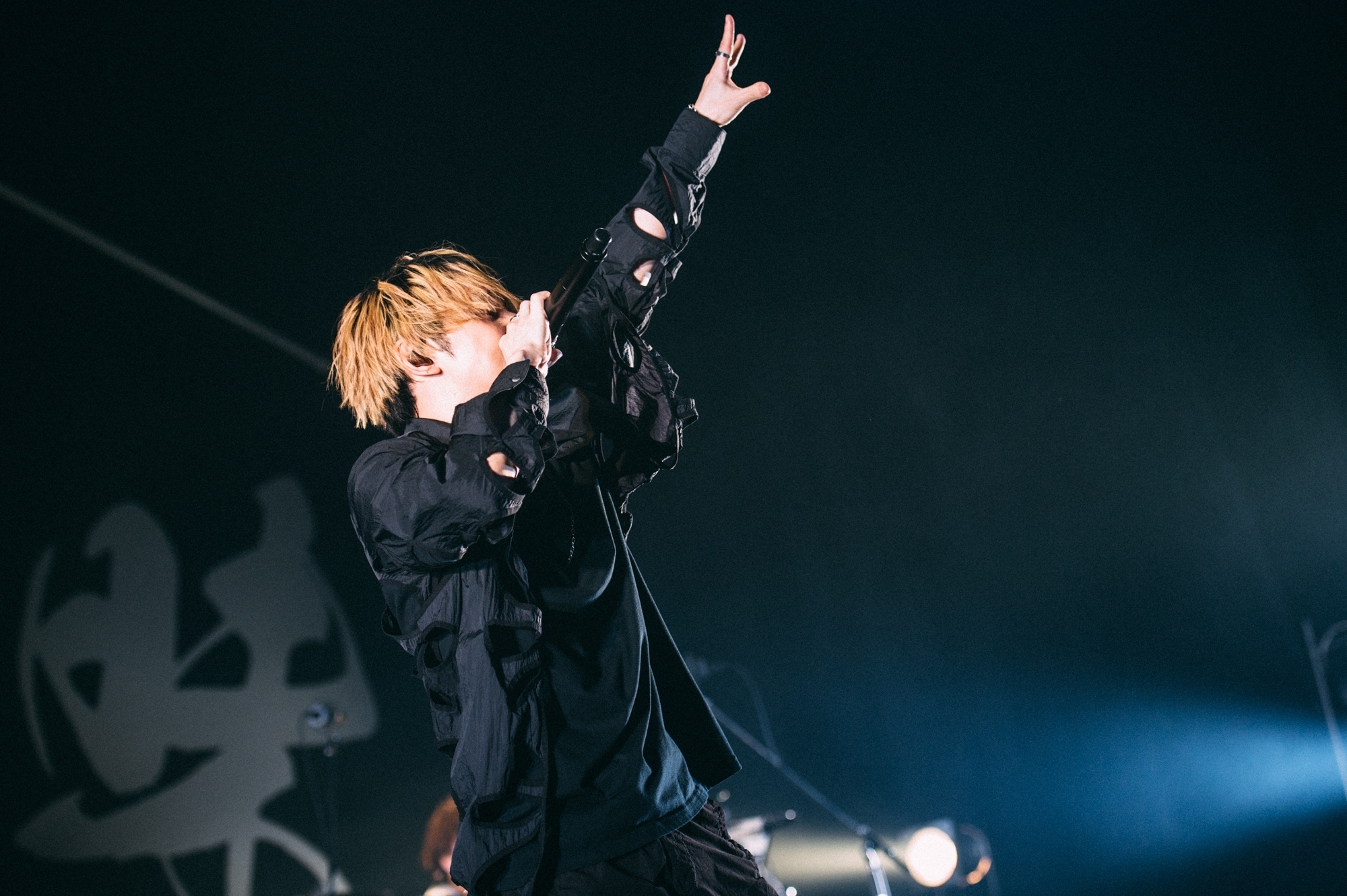 「To The First」のジングルと共に、DJとドラム、ギターを従えて登場したSKY-HI。「カンタンナコト」で登場した際の山中と揃いの白/黒の衣装から、全身黒一色の衣装にチェンジし、1曲目の「何様 FIRST TAKE Ver.」から、カニエ・ウェスト「POWER」とのマッシュアップで聴かせた「illusion」まで、ダークな世界をとことんストイックに表現する。ヘヴィロックなアプローチで聴かせた「F-3」では、ハードコアバンドとしてのルーツも持つマルチ音楽家でもあるビースティボーイズの「Ch-Check It Out」のフレーズをさらりと響かせ、ヒップホップ以降のロックバンド、THE ORAL CIGARETTESという、この日の対バン相手へのリスペクトを匂わせる。