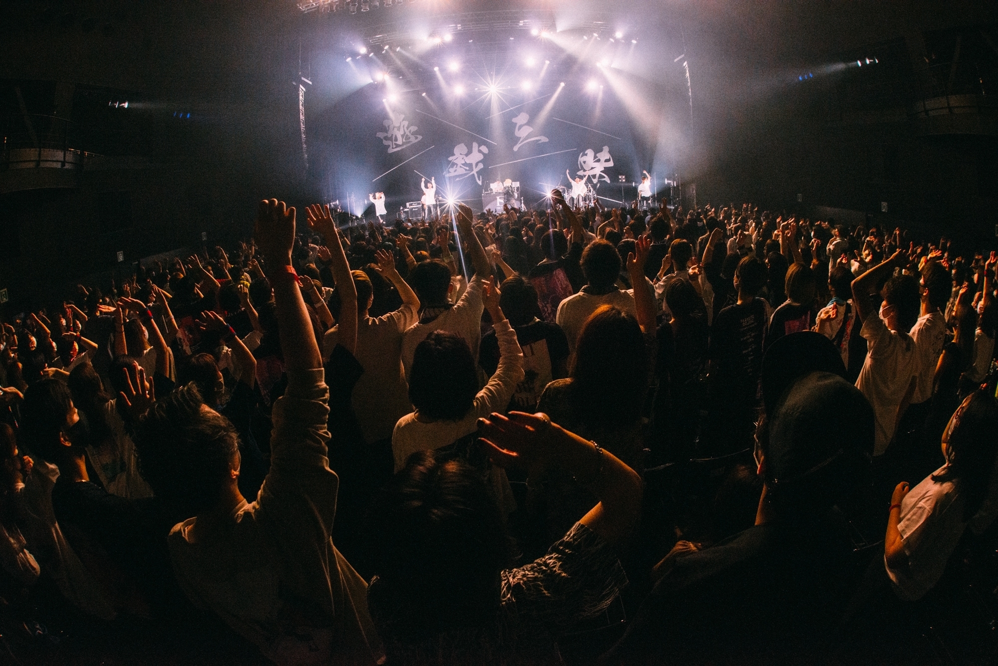 そして、ステージに並んだ山中、ギターの鈴木、ベースのあきら、ドラムの中西が最初に鳴らしたのは、「DIP-BAP」。感染症予防対策のため歓声をあげられないものの、観客たちはマスクの下でこぼれんばかりの笑顔を浮かべ、両手をあげて楽しそうに飛び跳ねている。さらに間髪入れずに披露されたのは、「Naked」。攻撃力の高いバンドグルーヴと、ラップ調にたたみかける妖しい歌声でフロアを魅了した後、山中がフロアに向かって話しかける。