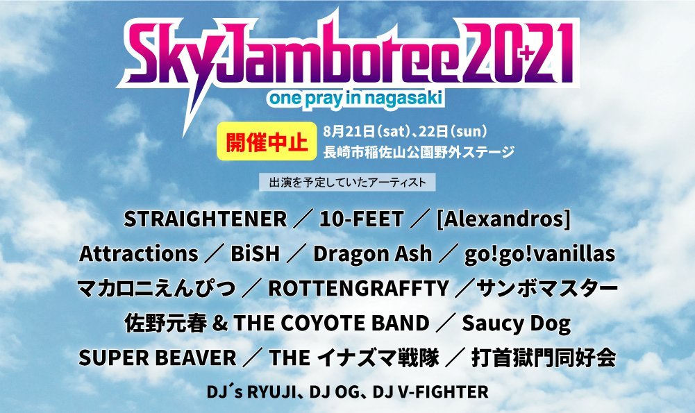 8月21・22日に、長崎市の稲佐山公園野外ステージにて開催を予定していた『Sky Jamboree 2021』が、現在の新型コロナウイルスの感染状況、また長崎県の医療体制の維持などを踏まえ中止することを発表した。