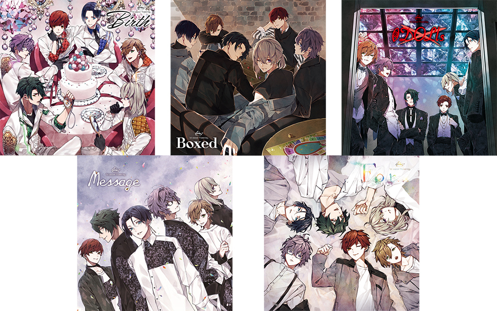 Anthos*/左からチセ CV:駒田航、灯堂理人 CV:伊東健人、八代刹那 CV:堀江瞬、結城眞紘 CV:山下誠一郎、影河凌駕 CV:濱野大輝、如月薫 CV:土岐隼一、清瀬陽汰 CV:増田俊樹 (C) 2019HANA-Doll