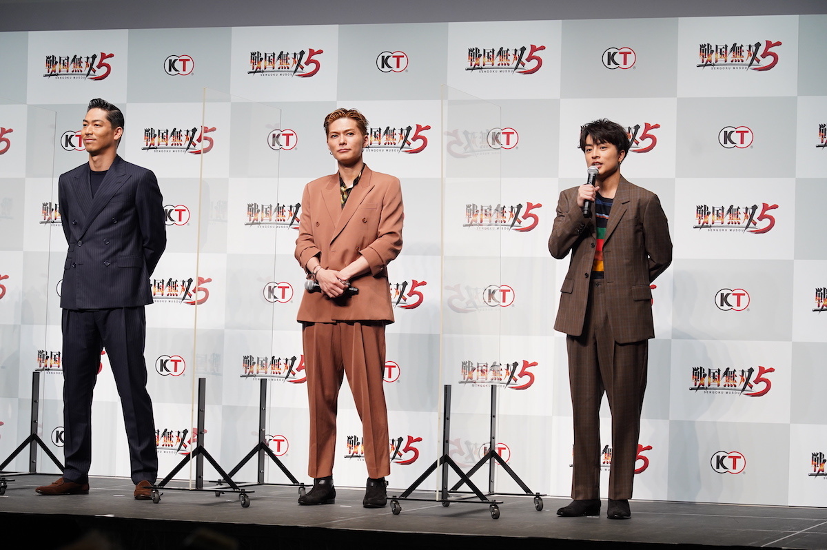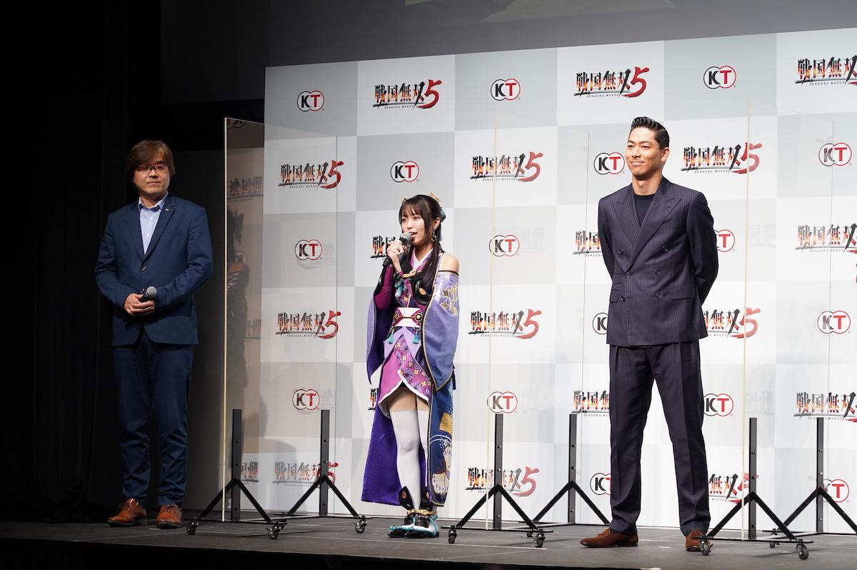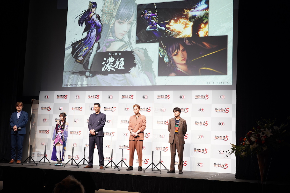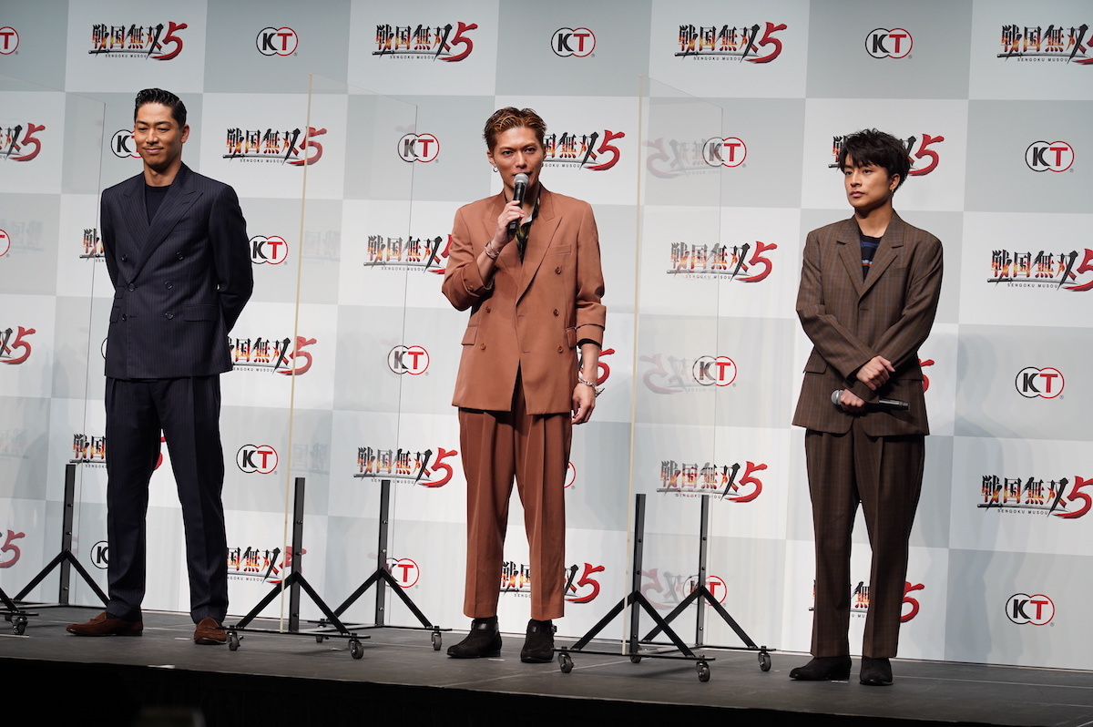 「戦国無双」シリーズ7年ぶりのナンバリング最新作『戦国無双5』の完成発表会が行われ、株式会社コーエーテクモゲームス代表取締役社長で『戦国無双5』プロデューサーの鯉沼久史氏と、テーマソング「One Nation」を担当したEXILEメンバーのAKIRA、SHOKICHI、白濱亜嵐、そして大原優乃が登壇した。