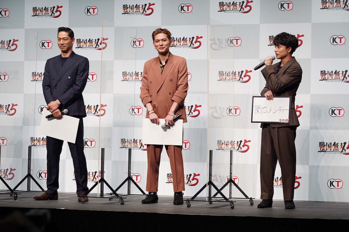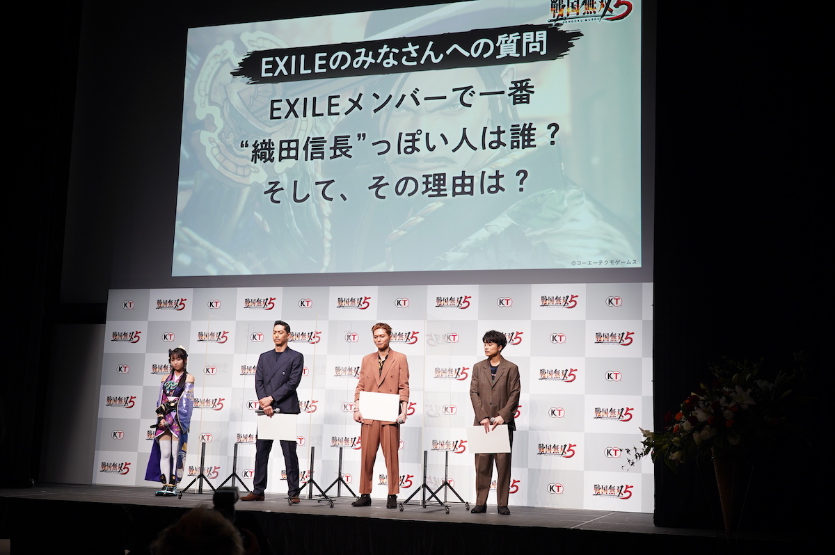 また発表会では“戦国無双”をキーワードに、いくつかの質問に答えるコーナーも。『戦国無双5』では、織田信長と明智光秀は友であり、ライバルという関係性が描かれる。「自身にとっての友でありライバルは?」という質問に、大原は「過去の自分、過去に自分が演じたキャラクターです」とコメント。白濱は「関口メンディー」、SHOKICHIは「白濱亜嵐」、AKIRAは「SHOKICHI」と答え、メンバーの絆、リスペクトを強く感じさせた。また、大原は「誰にも負けない無双なもの」として、カエルの鳴き声を披露。予想外のリアルなカエルの鳴き声に感心したAKIRAは「帰って早速練習します」と意気込み、SHOKICHIは「地元・北海道を思い出しました。茶色いカエルですね」と感想を述べ、白濱は「本当に草むらにいそうなカエルですね。天井に隠れているのかな」とキョロキョロと探す仕草を見せ、笑いを誘った。また「EXILEメンバーの中で織田信長っぽい人は?」という質問に、AKIRAと白濱は「HIROさん」と回答。SHOKICHIは「AKIRA」と回答。その理由は揃って“カリスマ性”と明かし、ここでもメンバー内の絆、リスペクトを見せていた。