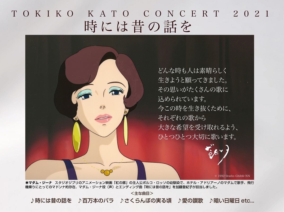 この公演では、スタジオジブリの映画『紅の豚』のエンディングソング「時には昔の話を」をテーマに、コロナ禍を生き抜く祈りと希望のメッセージを込めて歌唱。「さくらんぼの実る頃」「愛の讃歌」「百万本のバラ」ほか選び抜かれたプログラムとなっている。