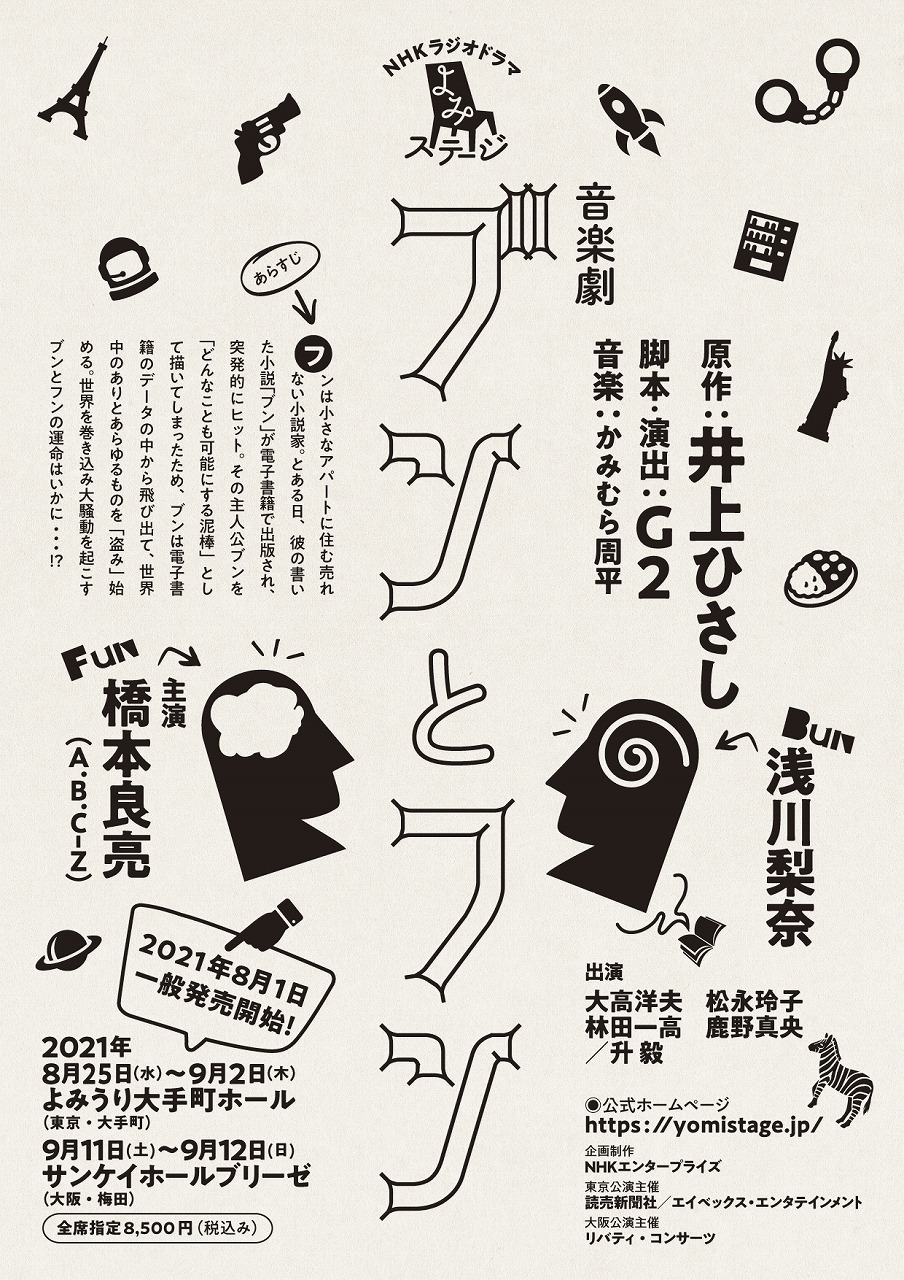 コロナ禍でも多くの方が体感し、楽しめるエンターテインメントを目指し企画された本企画の第一弾は、井上ひさしの小説家デビュー作となった記念碑的作品「ブンとフン」。井上がNHKラジオのために書き下ろしたのち、書籍化もされた伝説の作品が、今回、脚本・演出を手掛けるG2により、NHKラジオドラマ版と小説版を合わせ、令和版として甦る。