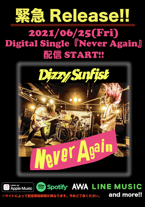 本日・6月24日(木)、5月13日より全国15か所15公演で開催されたシングルツアー『Dizzy Sunfist Looking for “ANDY” Tour 2021』ファイナル公演の大阪味園ユニバースのステージ上で、今夜0時(6月25日)に、新曲「Never Again」を配信リリースすることを発表した。