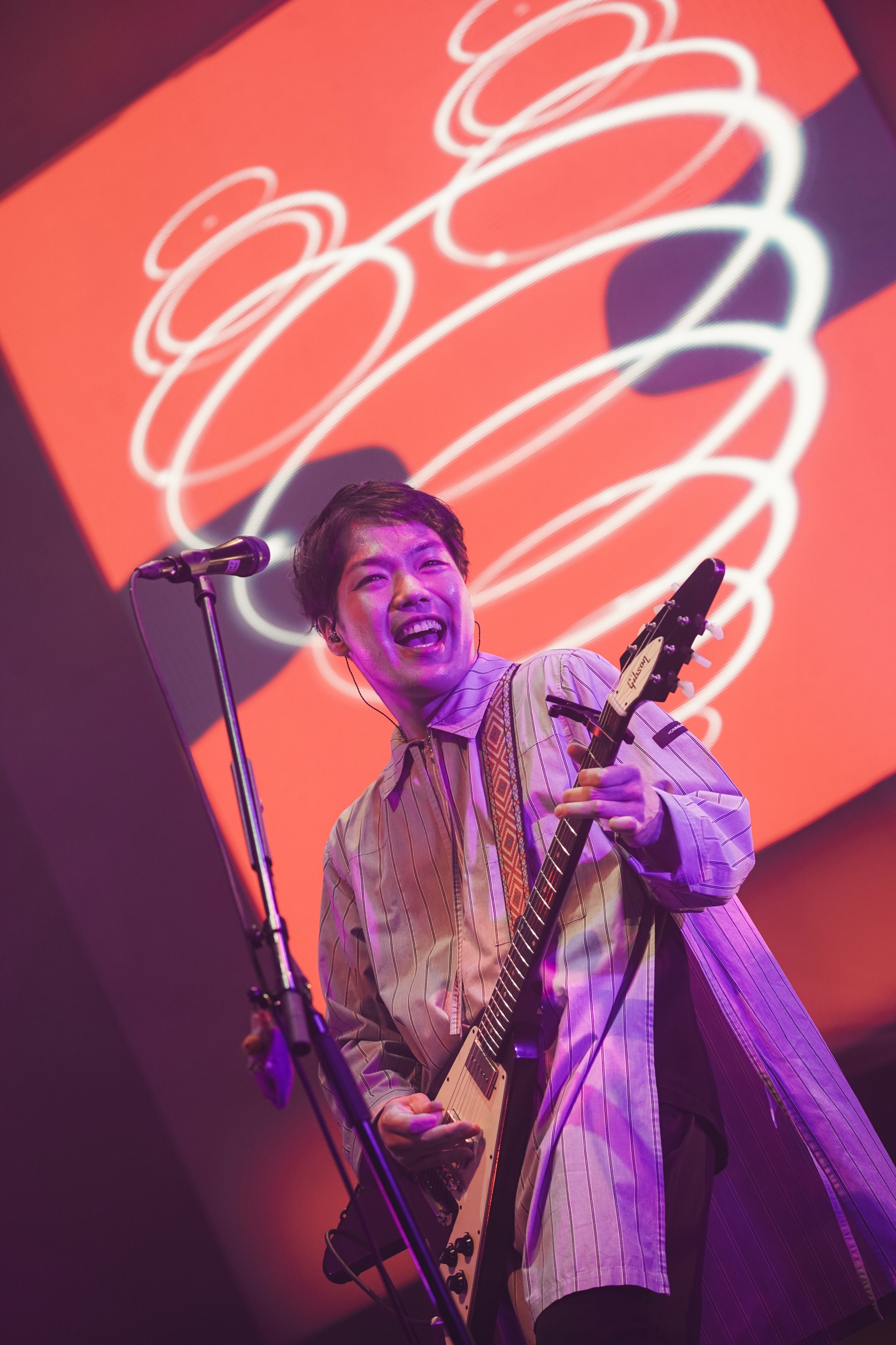そして、「俺の紹介はひと言で済ませますね。ロックスターです! 出会いばかりではなく、別れもたくさんあった春。渡せなかった花束を今さらだけど渡しに行く、そんな春の歌を」(はっとり)と、アウトロのノスタルジックでエモーショナルなギターソロが胸を貫いた「春の嵐」、ギターの掛け合いから強靭なポップネスを宿した「mother」と、壮大でありながら寄り添うようなマカロニえんぴつ特有のダイナズムを響かせ、パワフルなドラミングにカオスなギターと繊細なピアノが絡み付く「メレンゲ」と畳み掛ける! 最高のプレリュードを演出した新曲「八月の陽炎」では、はっとりが爪弾くメランコリーなギターと連動した風景の映像が、オレンジ色の光とともにまばゆい青春群像劇を描いていく。