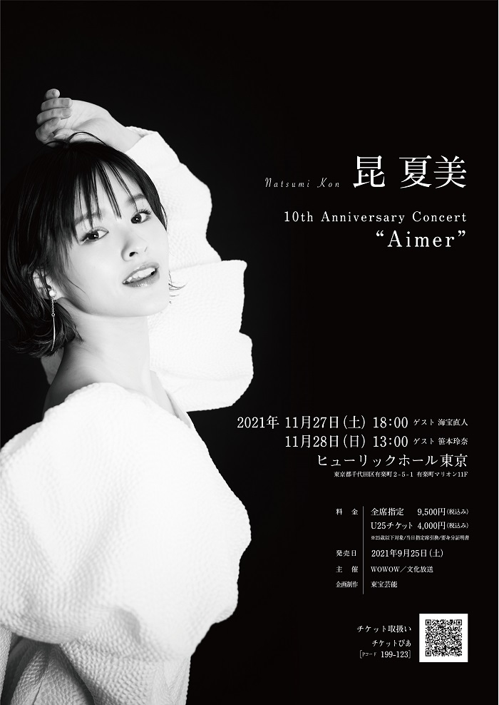 2021年11月27日(土)・28日(日)ヒューリックホール東京にて、ミュージカル女優 昆夏美がデビュー10周年を記念した6年振りとなるソロコンサート『Natsumi Kon 10th Anniversary Concert 「Aimer」』を開催することが決定した。