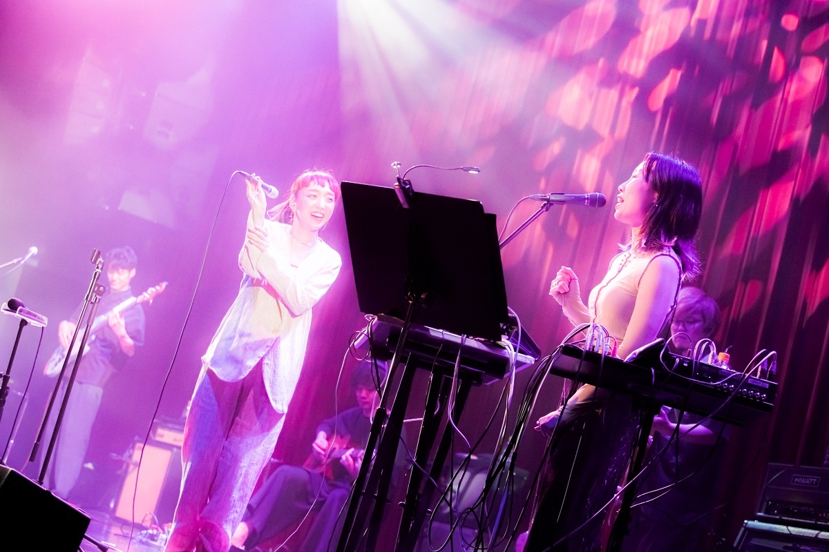 薄いピンクのジャケットとパンツ、スニーカーは鮮やかなオレンジ。軽やかにステップを踏みながら、クラップを煽りながら、圧倒的な声量と技巧で熱のこもった歌を聴かせる吉田沙良。立ち姿は常にクールでクレバー、ビートとメロディを司る万能インストゥルメント「Push」とエレクトリックベースを巧みに操る角田隆太。そこにサポートメンバーの小川翔(Gt)、西田修大(Gt)、沖メイ(Cho,Electronics)が加わるサウンドは、ジャズをベースにした精密なグルーヴ、R&Bやソウルの豊かなうねり、歌ものポップスのキャッチーなメロディを組み合わせた、実に表情豊かなものだ。
