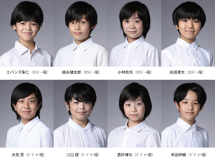 まず、注目のタイトルロール、孤独でありながら困難に立ち向かうオリバー・ツイスト役には、エバンズ隼仁(えばんず はやと・10才)、越永健太郎(こしなが けんたろう・11才)、小林佑玖(こばやし たすく・11才)、高畑遼大(たかはた りょうた・10才)の4人がクワトロキャストで演じる。(※五十音順/年齢は2021年7月1日時点)